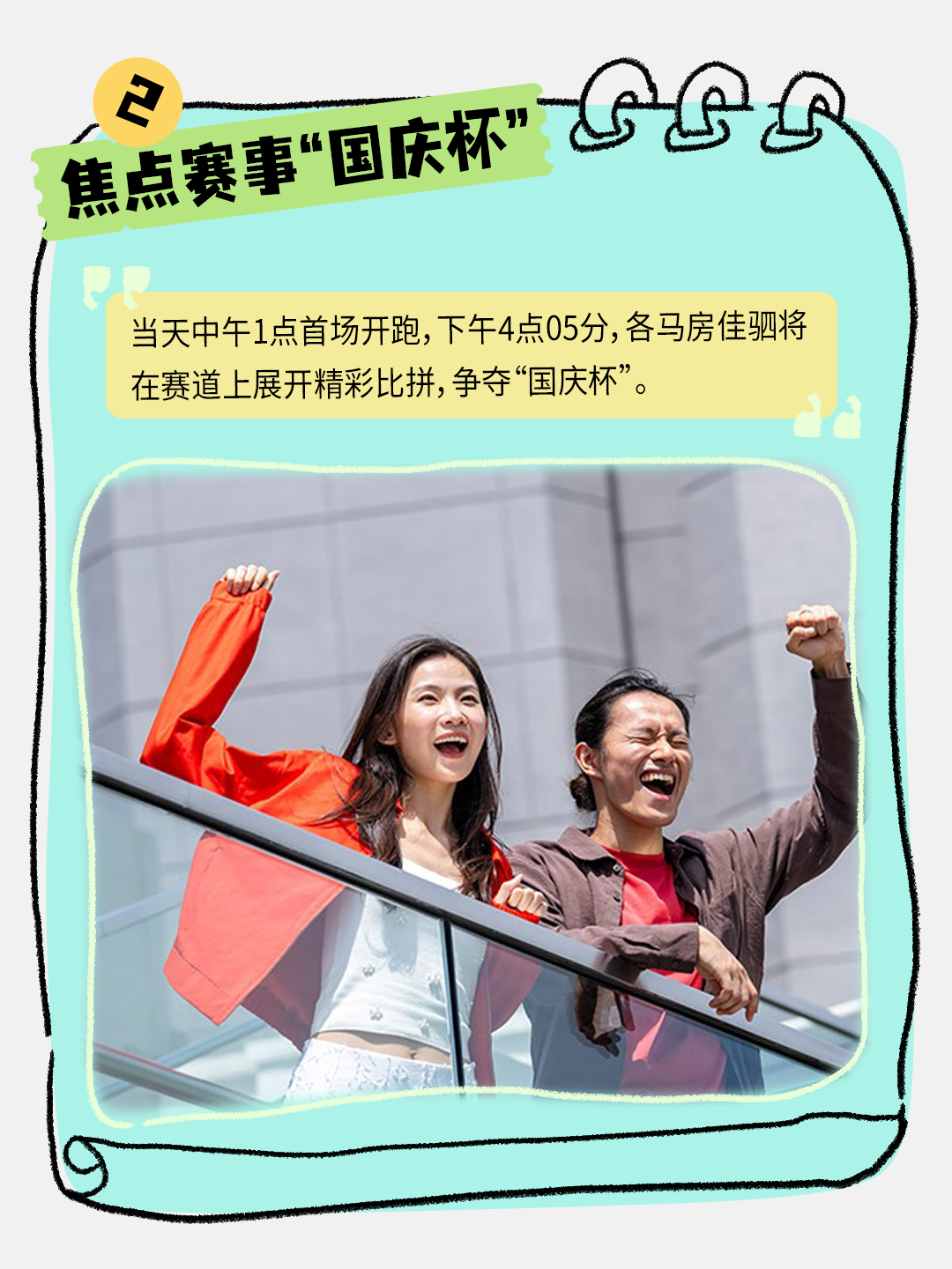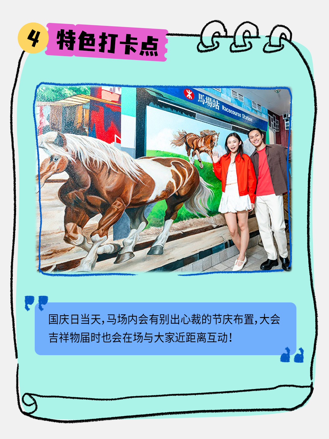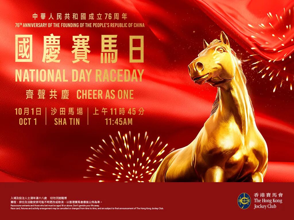 今年国庆日,沙田马场将隆重举办“国庆赛马日”特别活动,所有人士可免费进入沙田及跑马地马场公众席,共襄盛举,一同感受炽热气氛!