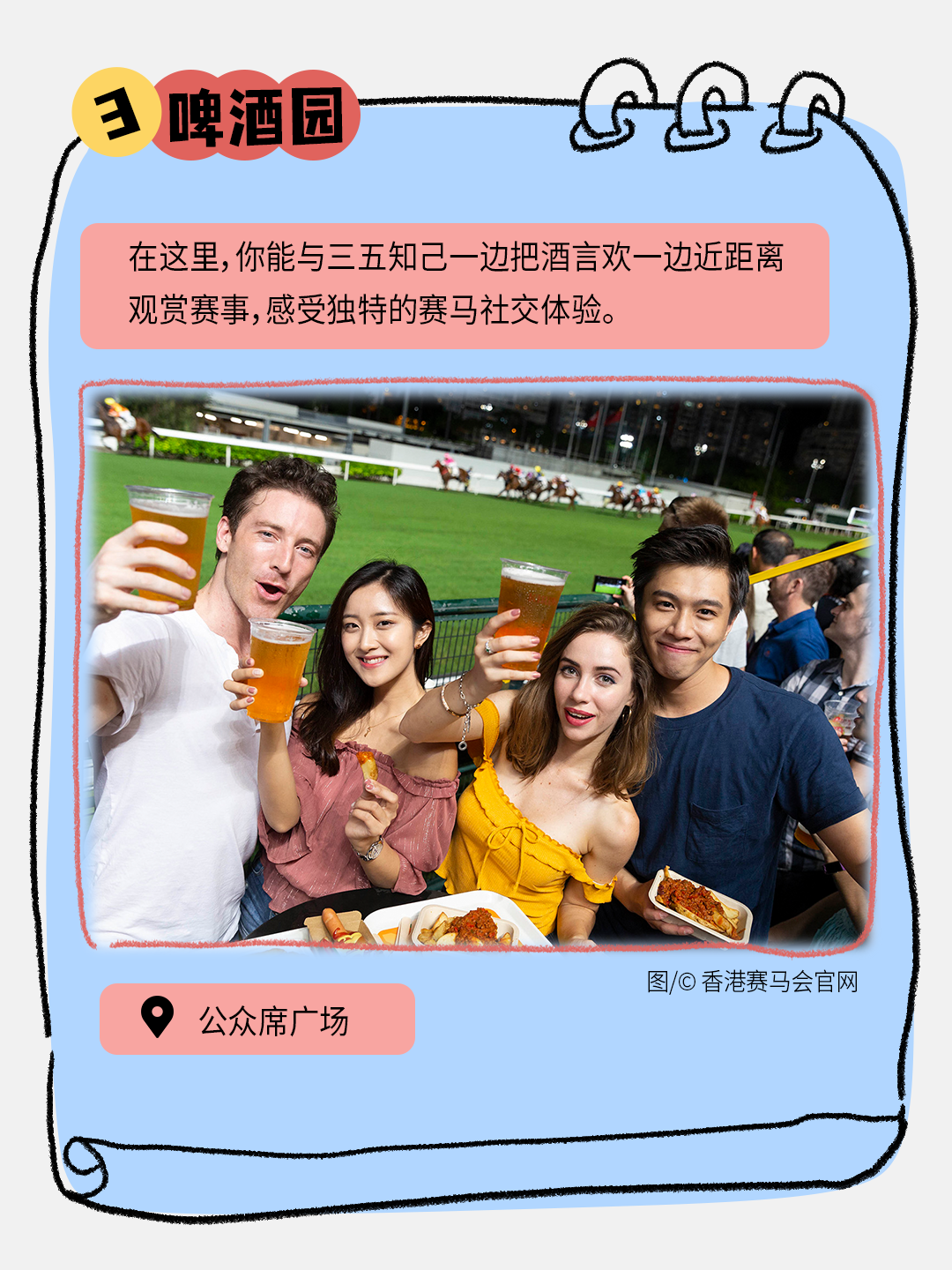 旅客支付港币220元,即可获得两张价值港币50元的餐饮券(可在马场内“啤酒园”美食车使用)及1张啤酒劵(可在马场内“啤酒园”使用),并可参加由旅游大使带领的马场导览活动。
