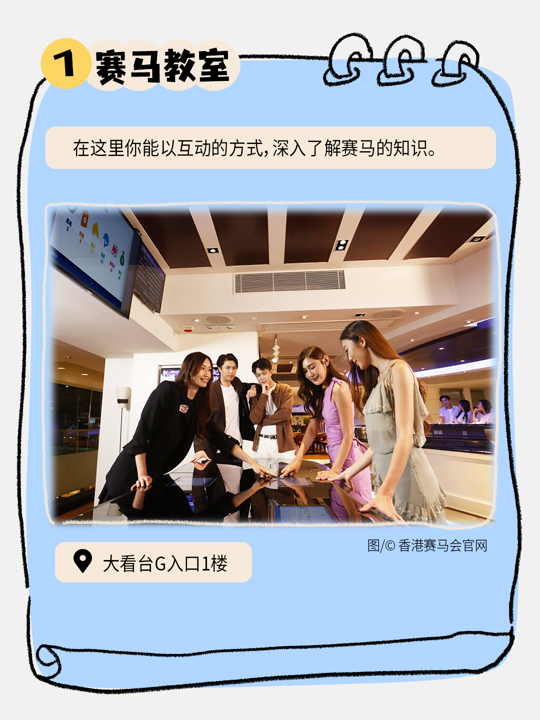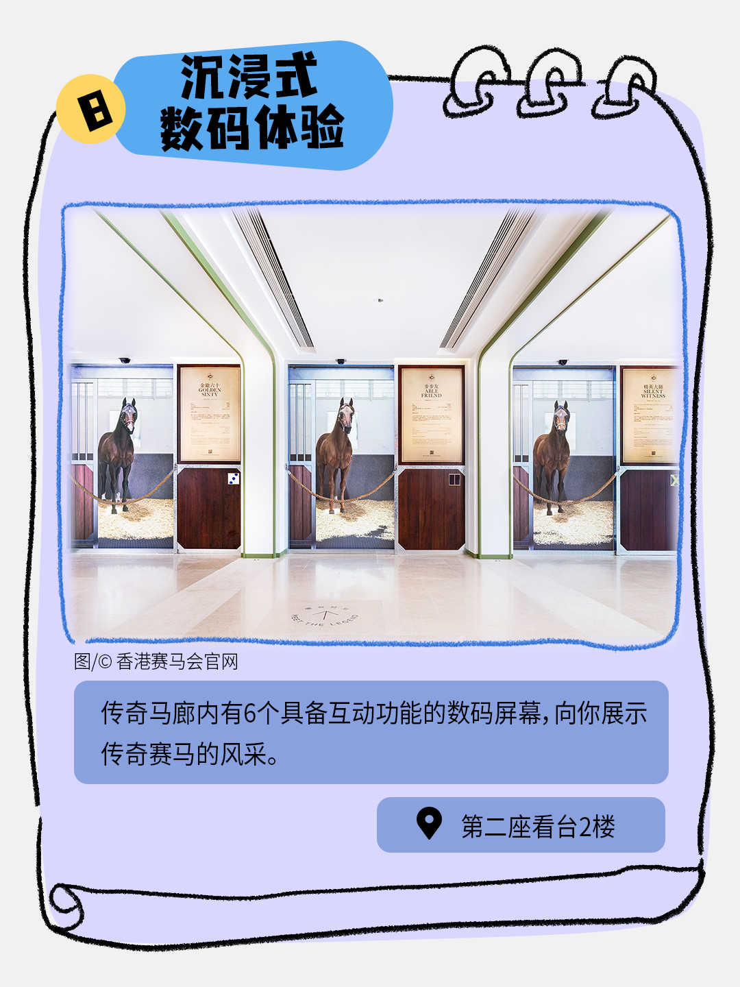 到访沙田马场的“游客专区”,开设户口后你即可解锁多重惊喜体验:通过虚拟方式游览从化马场,透过沉浸式VR化身为骑师感受虚拟训练实境、深入了解香港赛马会历史和拍照打卡与亲友分享这份独特的赛马乐趣。
