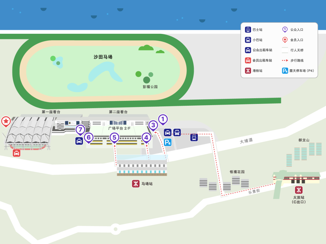 搭乘港铁东铁线至马场站(只于赛事日行驶)或火炭站C出口。*由火炭站步行至马场路程需时约15分钟。