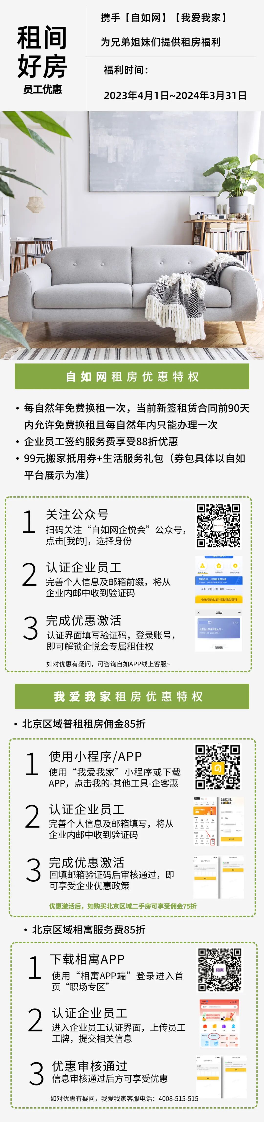 为了给金山的兄弟姐妹们提供更好的租房保障,贴心的行政小姐姐与我爱我家,自如网联合推出租房优惠,助力大家安置新家