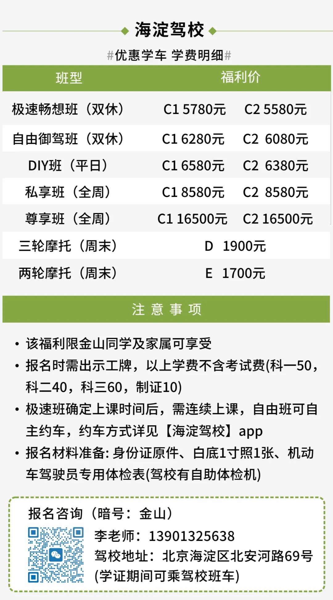 PS:4月14日“海淀驾校”的工作人员将来到金山大厦1层及小米科技园D栋2层为大家进行线下咨询解答,如需报名的小伙伴敬请期待~