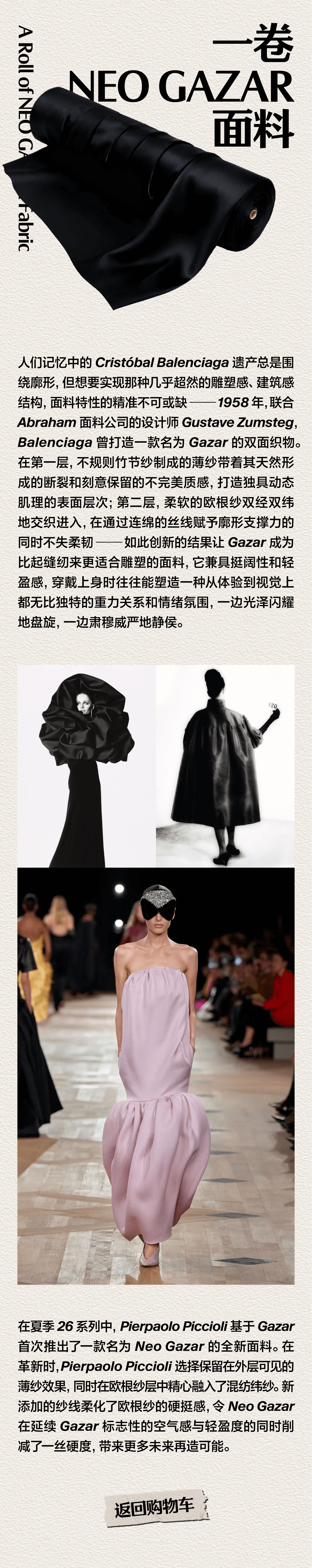 人们记忆中的 Cristóbal Balenciaga 遗产总是围绕廓形,但想要实现那种几乎超然的雕塑感、建筑感结构,面料特性的精准不可或缺 — 1958 年,联合 Abraham 面料公司的设计师 Gustave Zumsteg,Balenciaga 曾打造一款名为 Gazar 的双面织物。在第一层,不规则竹节纱制成的薄纱带着其天然形成的断裂和刻意保留的不完美质感,打造独具动态肌理的表面层次;第二层,柔软的欧根纱双经双纬地交织进入,在通过连绵的丝线赋予廓形支撑力的同时不失柔韧 — 如此创新的结果让 Gazar 成为比起缝纫来更适合雕塑的面料,它兼具挺阔性和轻盈感,穿戴上身时往往能塑造一种从体验到视觉上都无比独特的重力关系和情绪氛围,一边光泽闪耀地盘旋,一边肃穆威严地静侯。