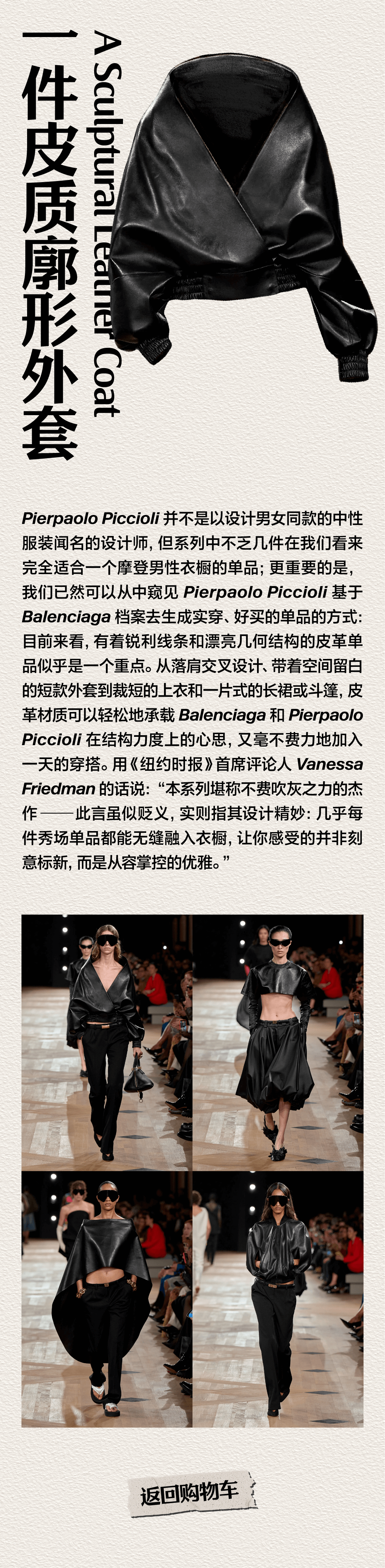 Pierpaolo Piccioli 并不是以设计男女同款的中性服装闻名的设计师,但系列中不乏几件在我们看来完全适合一个摩登男性衣橱的单品;更重要的是,我们已然可以从中窥见 Pierpaolo Piccioli 基于 Balenciaga 档案去生成实穿、好买的单品的方式:目前来看,有着锐利线条和漂亮几何结构的皮革单品似乎是一个重点。从落肩交叉设计、带着空间留白的短款外套到裁短的上衣和一片式的长裙或斗篷,皮革材质可以轻松地承载 Balenciaga 和 Pierpaolo Piccioli 在结构力度上的心思,又毫不费力地加入一天的穿搭。用《纽约时报》首席评论人 Vanessa Friedman 的话说:“本系列堪称不费吹灰之力的杰作 — 此言虽似贬义,实则指其设计精妙:几乎每件秀场单品都能无缝融入衣橱,让你感受的并非刻意标新,而是从容掌控的优雅。”