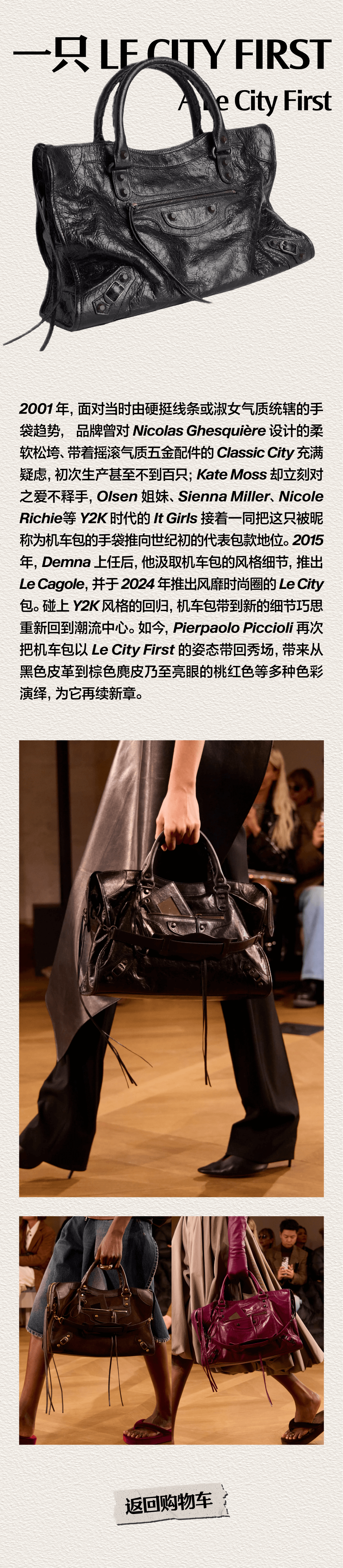 2001 年,面对当时由硬挺线条或淑女气质统辖的手袋趋势, 品牌曾对 Nicolas Ghesquière 设计的柔软松垮、带着摇滚气质五金配件的 Classic City 充满疑虑,初次生产甚至不到百只;Kate Moss 却立刻对之爱不释手,Olsen 姐妹、Sienna Miller、Nicole Richie等 Y2K 时代的 It Girls 接着一同把这只被昵称为机车包的手袋推向世纪初的代表包款地位。2015 年,Demna 上任后,他汲取机车包的风格细节,推出 Le Cagole,并于 2024 年推出风靡时尚圈的 Le City 包。碰上 Y2K 风格的回归,机车包带到新的细节巧思重新回到潮流中心。如今,Pierpaolo Piccioli 再次把机车包以 Le City First 的姿态带回秀场,带来从黑色皮革到棕色麂皮乃至亮眼的桃红色等多种色彩演绎,为它再续新章。