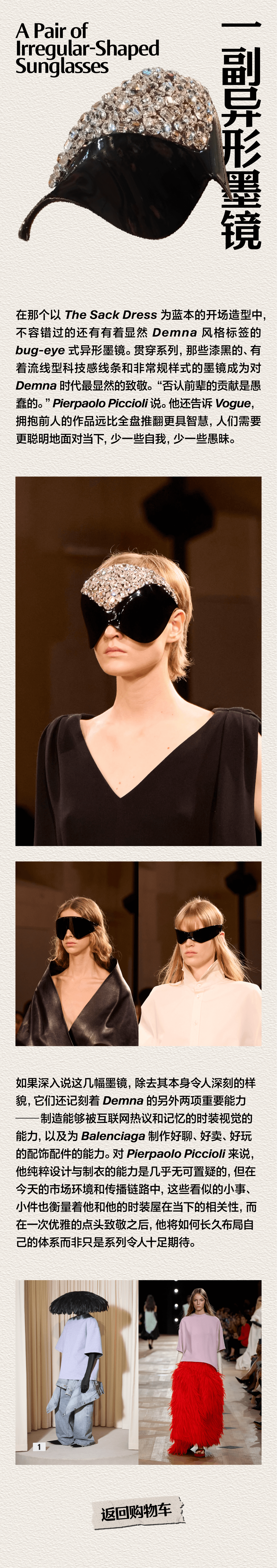 如果深入说这几幅墨镜,除去其本身令人深刻的样貌,它们还记刻着 Demna 的另外两项重要能力 — 制造能够被互联网热议和记忆的时装视觉的能力,以及为 Balenciaga 制作好聊、好卖、好玩的配饰配件的能力。对 Pierpaolo Piccioli 来说,他纯粹设计与制衣的能力是几乎无可置疑的,但在今天的市场环境和传播链路中,这些看似的小事、小件也衡量着他和他的时装屋在当下的相关性,而在一次优雅的点头致敬之后,他将如何长久布局自己的体系而非只是系列令人十足期待。