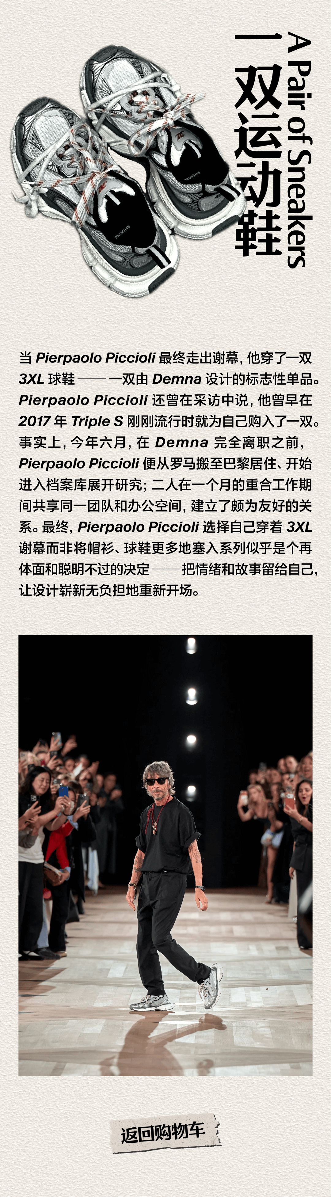 当 Pierpaolo Piccioli 最终走出谢幕,他穿了一双 3XL 球鞋 — 一双由 Demna 设计的标志性单品。Pierpaolo Piccioli 还曾在采访中说,他曾早在 2017 年 Triple S 刚刚流行时就为自己购入了一双。事实上,今年六月,在 Demna 完全离职之前,Pierpaolo Piccioli 便从罗马搬至巴黎居住、开始进入档案库展开研究;二人在一个月的重合工作期间共享同一团队和办公空间,建立了颇为友好的关系。最终,Pierpaolo Piccioli 选择自己穿着 3XL 谢幕而非将帽衫、球鞋更多地塞入系列似乎是个再体面和聪明不过的决定 — 把情绪和故事留给自己,让设计崭新无负担地重新开场。