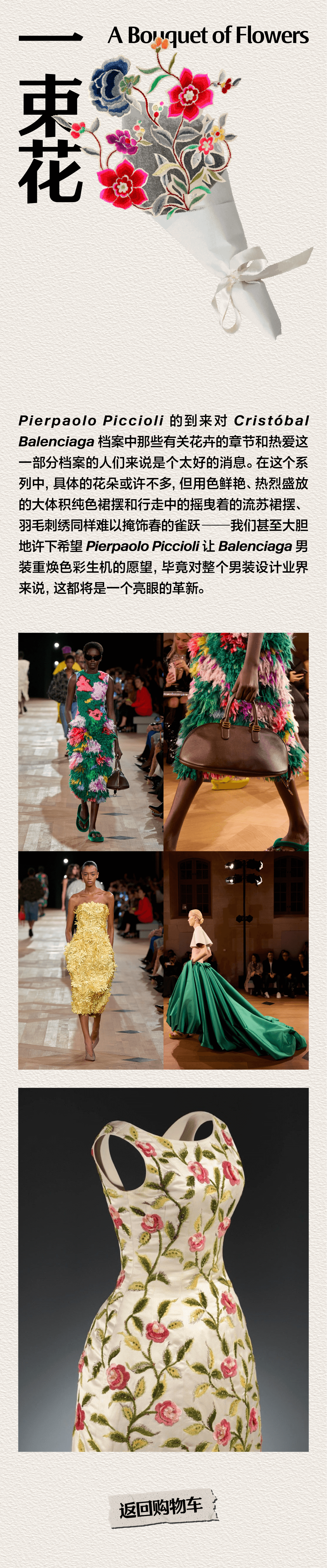 Pierpaolo Piccioli 的到来对 Cristóbal Balenciaga 档案中那些有关花卉的章节和热爱这一部分档案的人们来说是个太好的消息。在这个系列中,具体的花朵或许不多,但用色鲜艳、热烈盛放的大体积纯色裙摆和行走中的摇曳着的流苏裙摆、羽毛刺绣同样难以掩饰春的雀跃 — 我们甚至大胆地许下希望 Pierpaolo Piccioli 让 Balenciaga 男装重焕色彩生机的愿望,毕竟对整个男装设计业界来说,这都将是一个亮眼的革新。