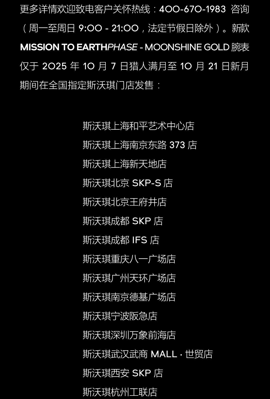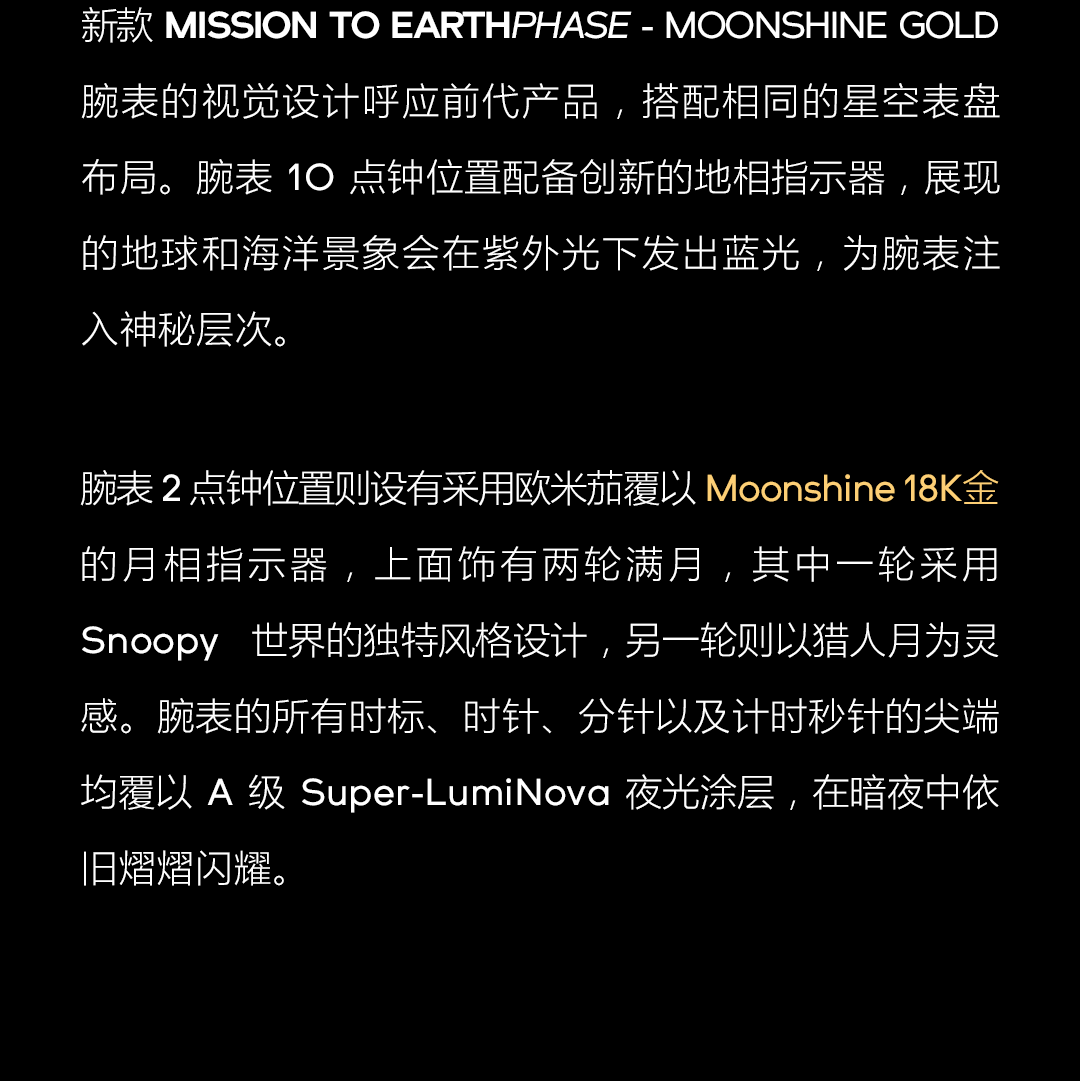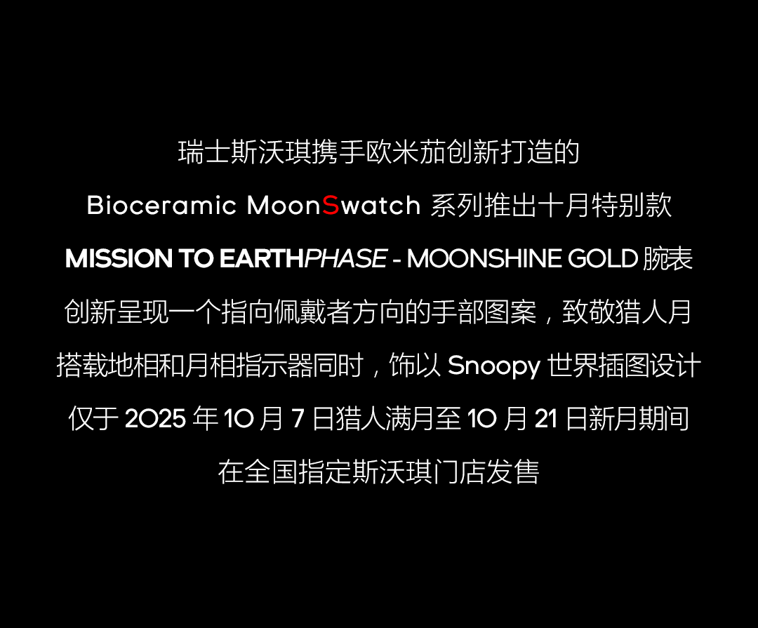 摘要:十月特别款 MISSION TO EARTHPHASE - MOONSHINE GOLD联名腕表,仅于 2025 年 10 月 7 日猎人满月至 10 月 21 日新月期间在全国指定斯沃琪门店发售