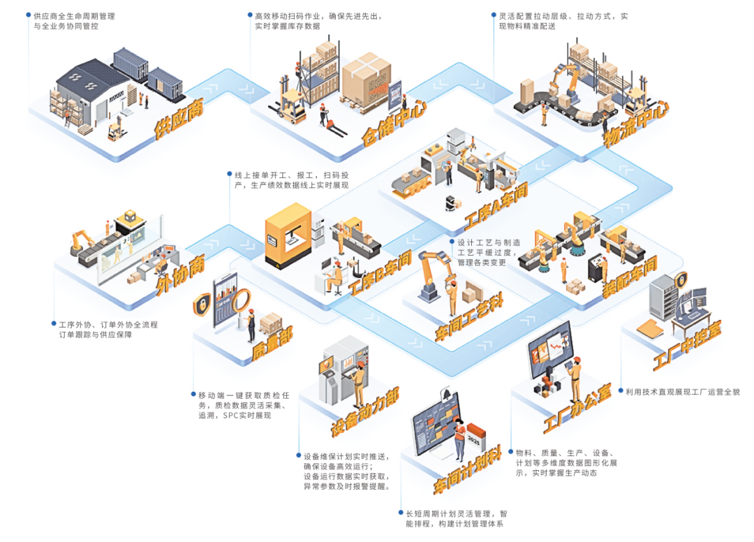 金软MOM系统解决方案以承载工厂智能化、企业数智化应用场景的实现为目标,充分打通设备层、控制层、执行层与营运管理层,聚焦汽摩配件、医药化工、泵与电机、缝制设备、塑料模具、卫浴阀门、植保机械、航天航空等行业深度实践。