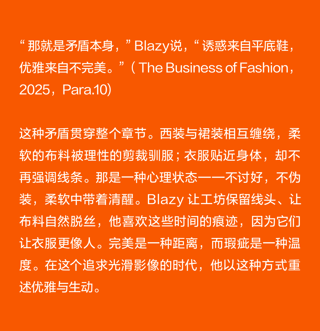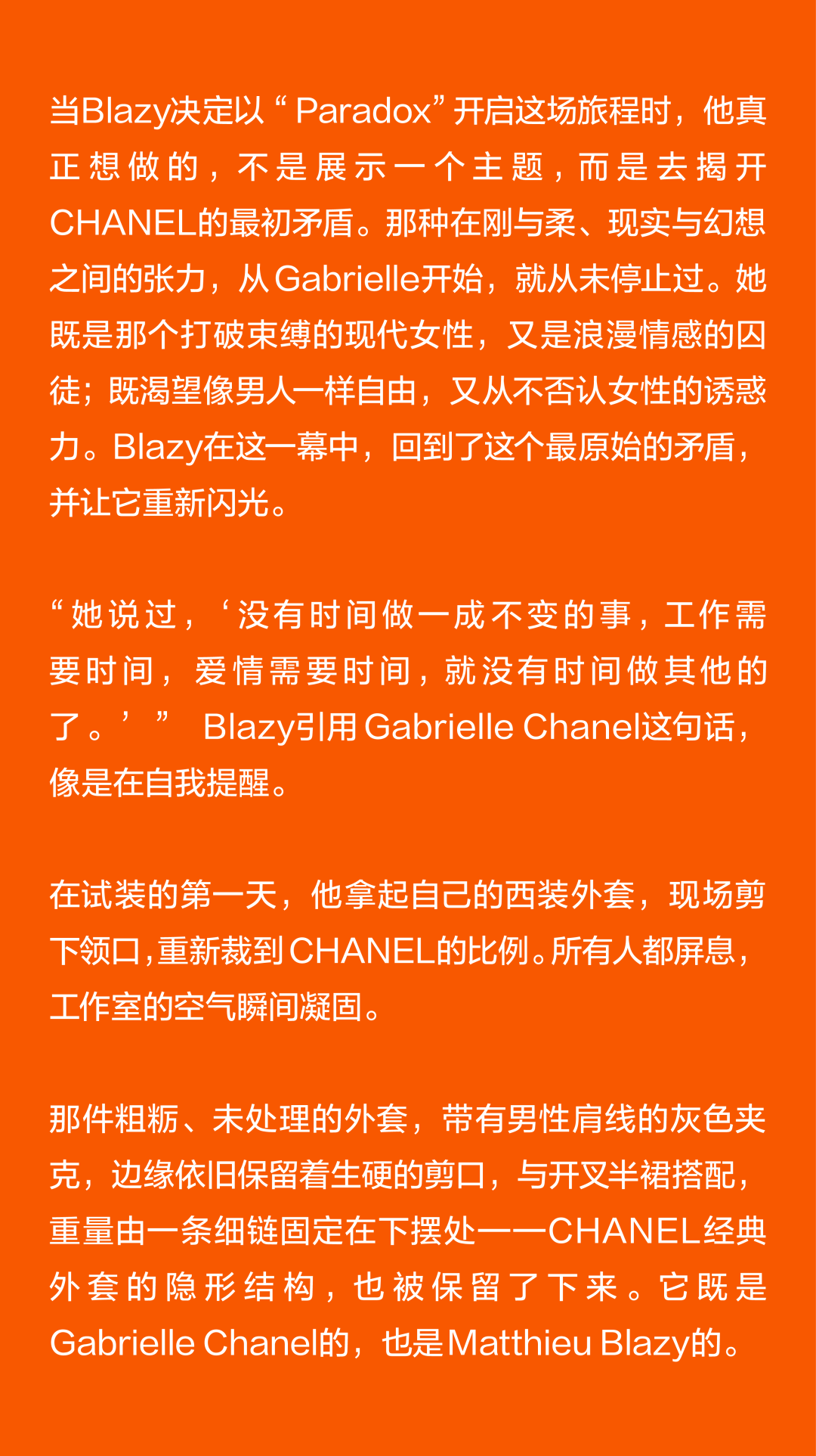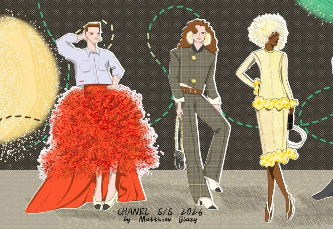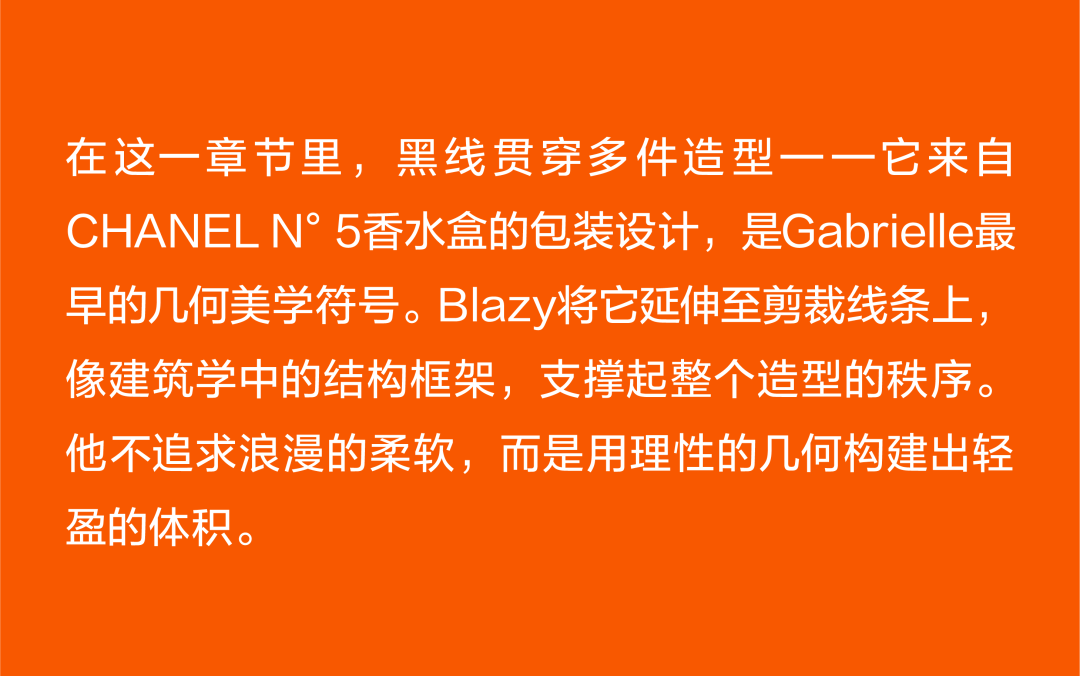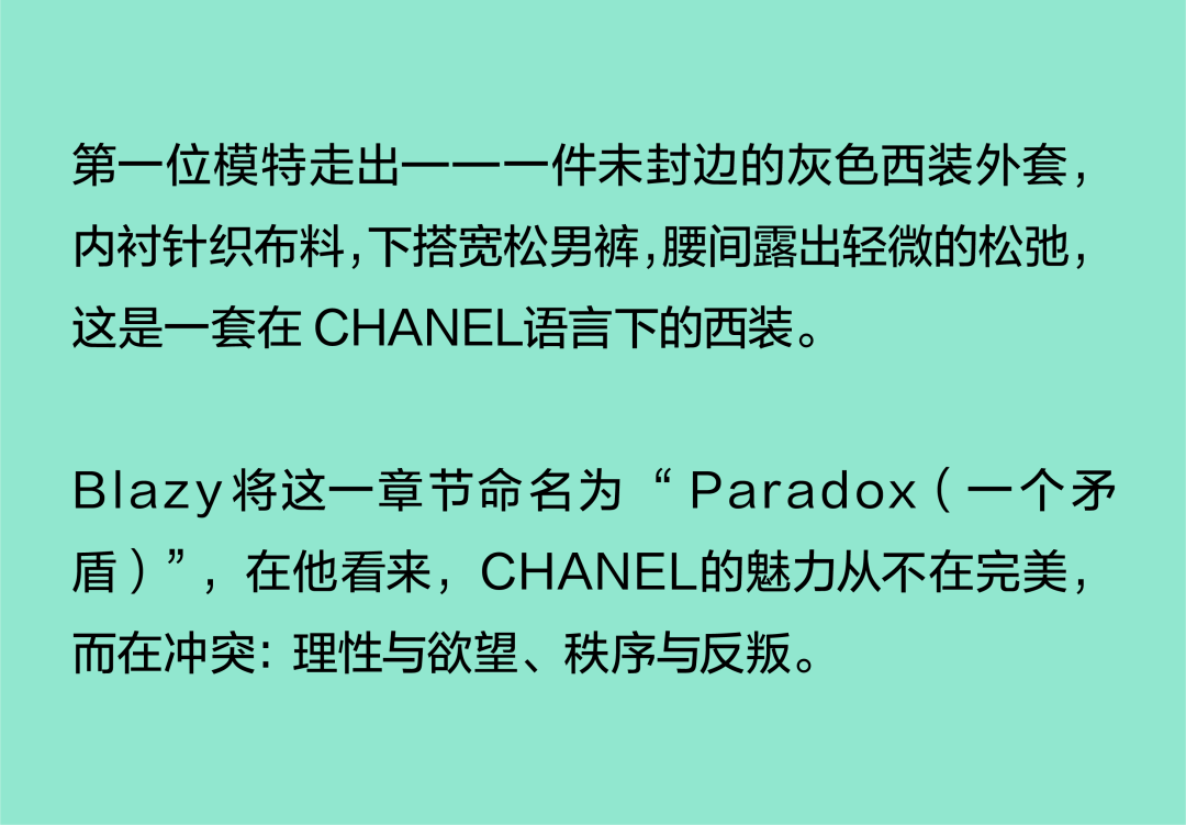 Matthieu Blazy加入CHANEL,这个品牌的时间开始以另一种方式流动。不是延续,也不是断裂,而是以一种更深层的重启——一种关于“如何在当下继续存在”的实验。从这一刻起,CHANEL的未来,不再被定义为“继承谁”而是“如何再次成为世界的一部分”。 2026春夏时装周,我们见证了十多位新创意总监的首秀,Matthieu Blazy的CHANEL首秀在这场“时尚大考”中终于“千呼万唤始出来”,让本季时装周以高潮收束,也让我们愈发感受到创意总监的更替,更像是一场时装范式转换——当许多奢侈品牌还沉迷于“遗产叙事”和“图案重组”时,Matthieu Blazy 把 CHANEL 拽回了现实。 Matthieu Blazy没有仅复刻经典,也没有只延续神话,他拔掉了品牌的安全插头,从“衣服”重新开始:面料、比例、重力、坠感。在一个被复古怀旧与社交媒体滤镜包裹的时代,几乎是一种反叛。 Blazy为整个奢侈品行业打开了一个全新的通道:设计师不必再做档案的守门人,也不必活在社交媒体的滤镜逻辑下。这也意味着接下来几年,大品牌们将不得不重新审视自己:继续卖符号,还是重新造语言? CHANEL 在这一刻,成为了那个临界点。Blazy 没有延续任何人的脚步,他正从零开始,为 CHANEL 构建了一个新的宇宙——一个关于重力、自由与未来的宇宙。 1. 背影的意义:Matthieu Blazy 与 CHANEL 的零重力时刻 那是一张几乎没有时间的照片。黑白的世界里,一个女人背对镜头,头发被剪成近乎几何的短波波头,末梢微微卷起,像羽毛在空气中轻颤。她的肩颈线裸露、细长,皮肤的亮度与背景的白几乎融为一体,唯一的界限是一道柔软的阴影。右上角,孤独的“双 C”悬浮着——像一颗行星,一种信号。 没有珍珠、没有香水、没有斜纹软呢,也没有那种惯常的法式姿态。她什么都没说,却什么都代表。 这便是 Matthieu Blazy 为 CHANEL 留下的第一张图像。由 David Bailey 拍摄,这张照片在公布后引起了短暂的静默——一种集体的屏息。它既不像广告,也不像预告,更像一记无声的宣言:CHANEL 的故事,将从“背影”重新开始。 这张背影既是隐喻,也是策略。它意味着他不打算以传统方式进入 CHANEL 的语言体系,而是先让它归零。那是一种“反品牌”的姿态:在一个被符号与记忆淹没的时代,他选择用沉默取代噪音。随后,品牌寄出了大秀邀请函——附上一条银色小房子吊坠项链。吊坠的形状是 康朋街31号 31 号,那座 CHANEL 的精神原点。俨然,这枚小吊坠与那张背影一样,暗示了一种行动:离开、重启、寻找新的引力。 当 Blazy 第一次走进 CHANEL 档案馆时,Blazy看见那些保存完好的样衣、缝线、刺绣样本、Karl Lagerfeld 的草图,全都散发着强烈的既视感——你需要一个梦想,讲故事,”(The Business of Fashion,2025,Para.23)。于是他停止前往档案馆,转而去读书——旧信件、早期访谈与传记。在文字中,他遇见了另一个 Gabrielle。 就在那段时间,Blazy 偶然看到几张 Gabrielle 穿着男式衬衫的老照片——宽松、洁白、未经造型,布料在她的身体上自然坠下,既中性又带着一种无意的性感。那一刻,他找到了线索。于是他与位于巴黎旺多姆广场的 Charvet 合作,重制了一系列衬衫。每件作品的内侧都缝着 “Tissu et technique par Charvet” 的标签,用 1920 年代 CHANEL 标签上略带颤动的手写字体刺绣。 这件衬衫成为他理解 CHANEL 的真正起点。它让他重新看见一种被遗忘的呼吸方式——一种从日常出发的自由。 在 Blazy 看来,或许那是 CHANEL 最本质的姿态:将私人情感转化为风格,将爱变成一种逃逸的可能。 而这场逃逸,在秀场上被放大成宇宙。 当晚,大皇宫的穹顶被改造成一个行星系统:十二颗不同颜色的星球缓缓旋转,地面漆成深蓝,光线游移如液体。Blazy 称之为“Universal(一个宇宙)”——一个无边的空间,象征 CHANEL 从巴黎出发,进入普世维度。 这些星球不是装饰,而是隐喻。红色代表激情与力量,铜色呼应 Gabrielle 的幸运符麦穗,乳白色由 LEMARIÉ山茶花及羽饰坊以羽饰拼制——柔软、脆弱,却永恒。每一颗星球都是一个时代的碎片,一段记忆的再生。 第一位模特走出——一件未封边的灰色西装外套,内衬针织布料,下搭宽松男裤,腰间露出轻微的松弛,这是一套在 CHANEL 语言下的西装。Blazy 将这一章节命名为 “Paradox(一个矛盾)”,在他看来,CHANEL 的魅力从不在完美,而在冲突:理性与欲望、秩序与反叛。 2. 从戏服到衣橱——剪刀落下的矛盾与白昼 当 Blazy 决定以 “Paradox” 开启这场旅程时,他真正想做的,不是展示一个主题,而是去揭开 CHANEL 的最初矛盾。那种在刚与柔、现实与幻想之间的张力,从 Gabrielle 开始,就从未停止过。她既是那个打破束缚的现代女性,又是浪漫情感的囚徒;既渴望像男人一样自由,又从不否认女性的诱惑力。Blazy 在这一幕中,回到了这个最原始的矛盾,并让它重新闪光。 “她说过,‘没有时间做一成不变的事,工作需要时间,爱情需要时间,就没有时间做其他的了。 ’”Blazy 在采访中重复这句话时,神情专注,几乎像在自我提醒。 在试装的第一天,他拿起自己的西装外套,现场剪下领口,重新裁到 CHANEL 的比例。所有人都屏息,工作室的空气瞬间凝固。那件粗粝、未处理的外套,带有男性肩线的灰色夹克,边缘依旧保留着生硬的剪口,与开叉半裙搭配,重量由一条细链固定在下摆处——CHANEL 经典外套的隐形结构,也被保留了下来。它既是 Gabrielle 的,也是 Matthieu 的。 “那就是矛盾本身,”