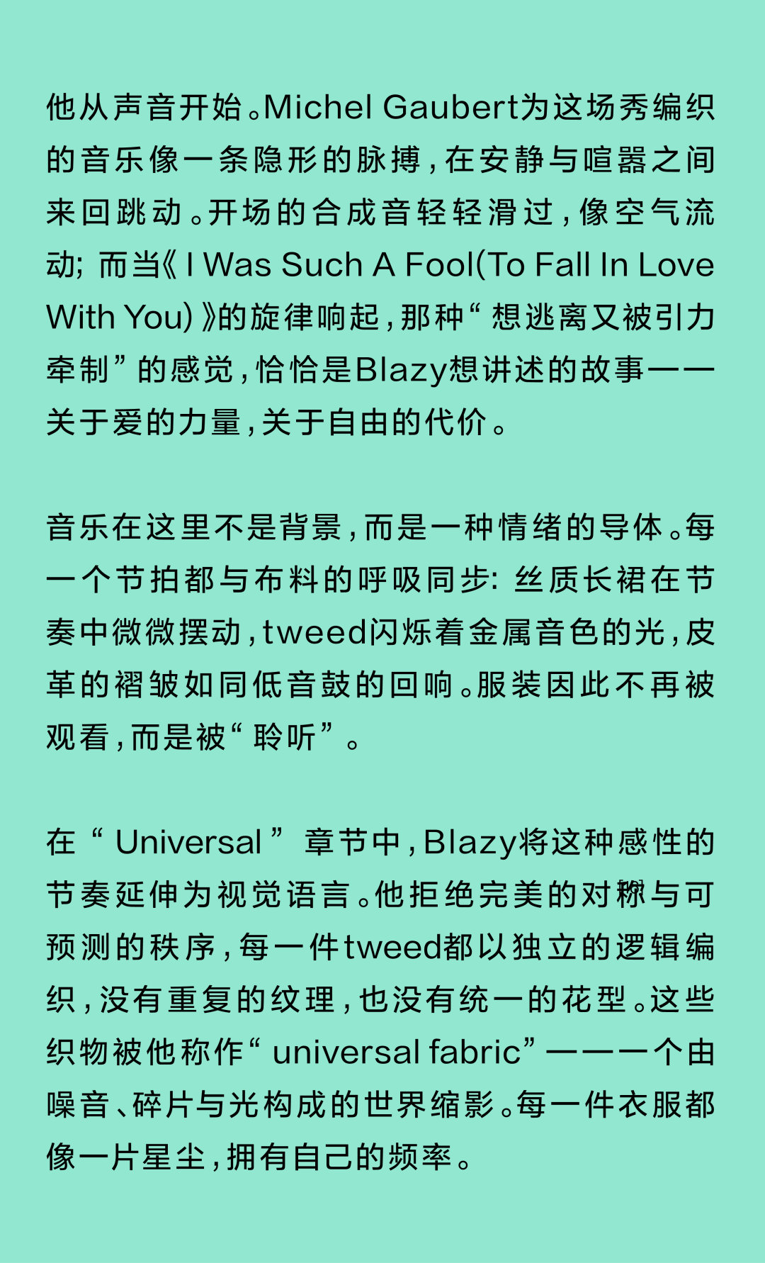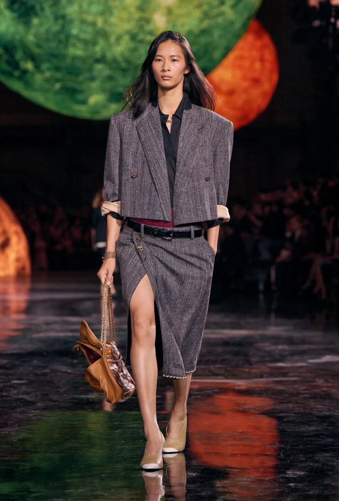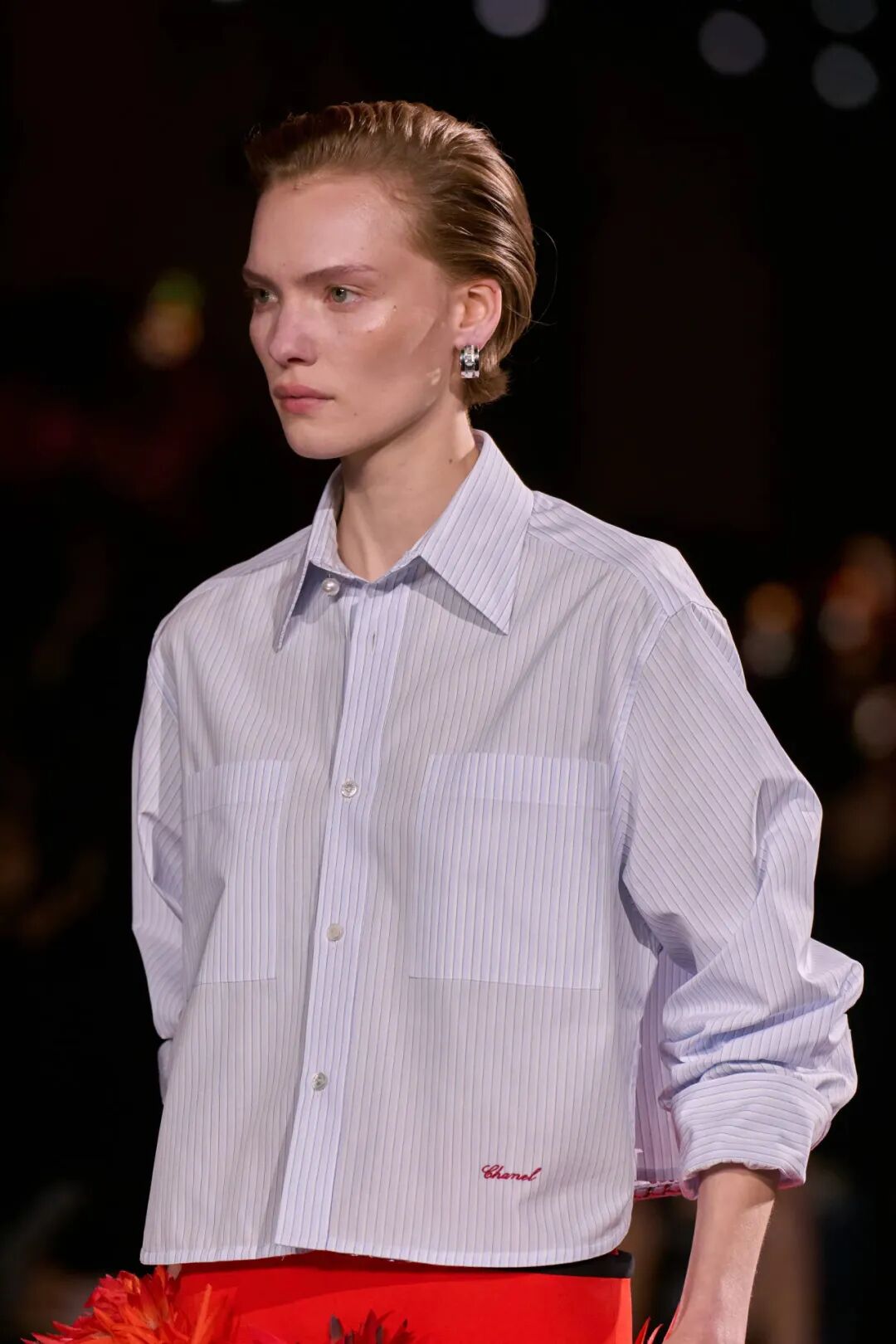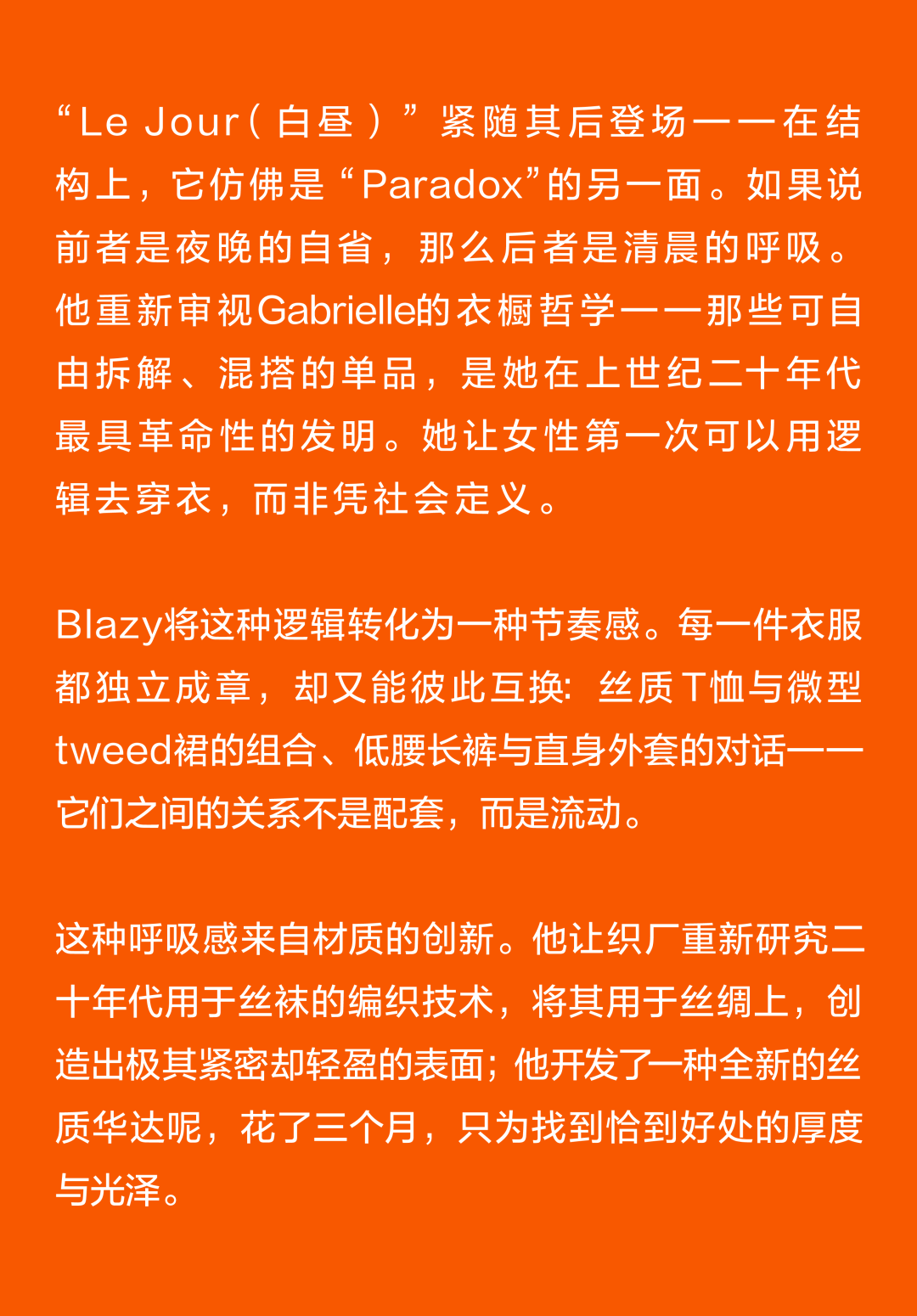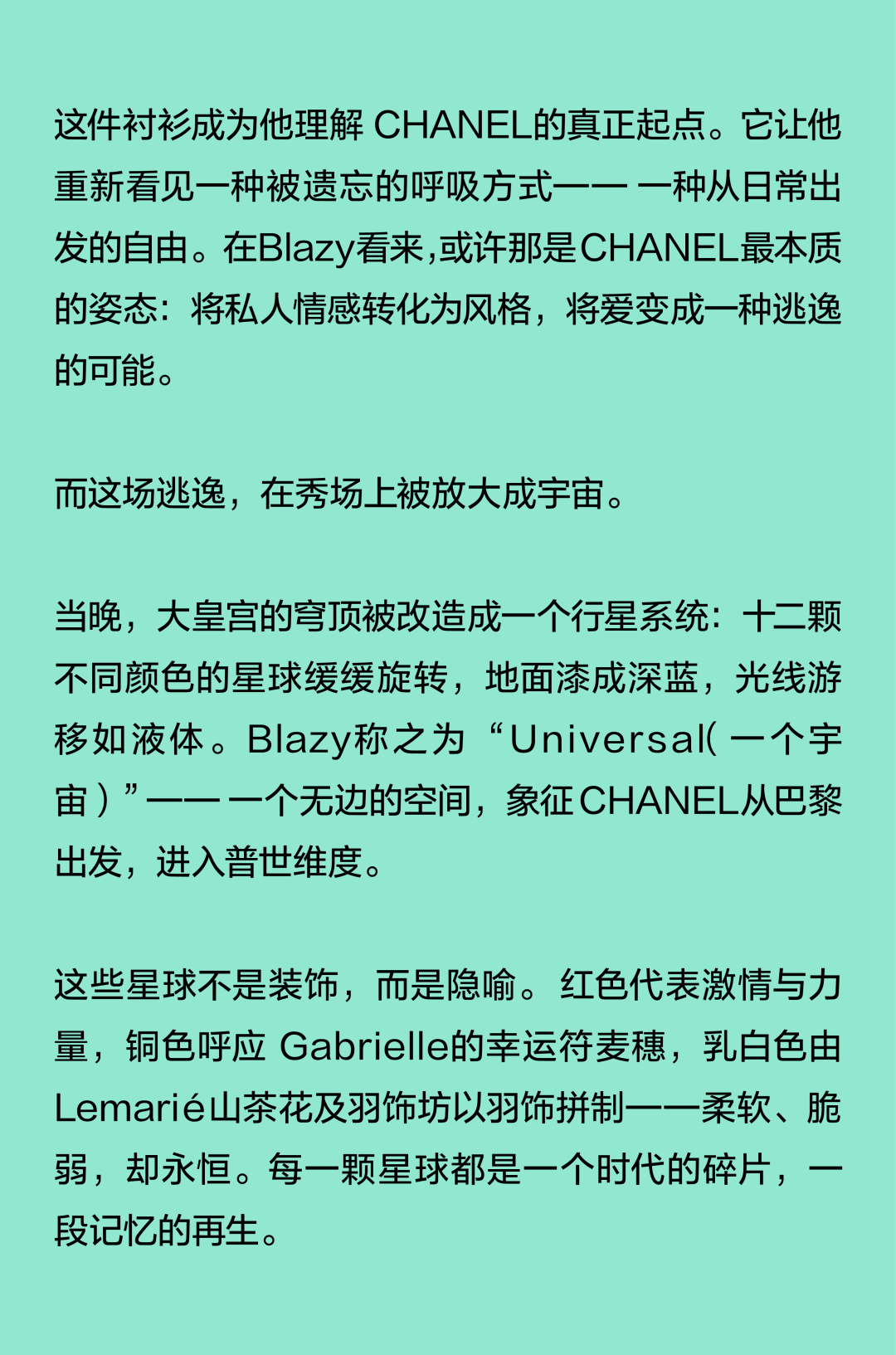 Matthieu Blazy加入CHANEL,这个品牌的时间开始以另一种方式流动。不是延续,也不是断裂,而是以一种更深层的重启——一种关于“如何在当下继续存在”的实验。从这一刻起,CHANEL的未来,不再被定义为“继承谁”而是“如何再次成为世界的一部分”。 2026春夏时装周,我们见证了十多位新创意总监的首秀,Matthieu Blazy的CHANEL首秀在这场“时尚大考”中终于“千呼万唤始出来”,让本季时装周以高潮收束,也让我们愈发感受到创意总监的更替,更像是一场时装范式转换——当许多奢侈品牌还沉迷于“遗产叙事”和“图案重组”时,Matthieu Blazy 把 CHANEL 拽回了现实。 Matthieu Blazy没有仅复刻经典,也没有只延续神话,他拔掉了品牌的安全插头,从“衣服”重新开始:面料、比例、重力、坠感。在一个被复古怀旧与社交媒体滤镜包裹的时代,几乎是一种反叛。 Blazy为整个奢侈品行业打开了一个全新的通道:设计师不必再做档案的守门人,也不必活在社交媒体的滤镜逻辑下。这也意味着接下来几年,大品牌们将不得不重新审视自己:继续卖符号,还是重新造语言? CHANEL 在这一刻,成为了那个临界点。Blazy 没有延续任何人的脚步,他正从零开始,为 CHANEL 构建了一个新的宇宙——一个关于重力、自由与未来的宇宙。 1. 背影的意义:Matthieu Blazy 与 CHANEL 的零重力时刻 那是一张几乎没有时间的照片。黑白的世界里,一个女人背对镜头,头发被剪成近乎几何的短波波头,末梢微微卷起,像羽毛在空气中轻颤。她的肩颈线裸露、细长,皮肤的亮度与背景的白几乎融为一体,唯一的界限是一道柔软的阴影。右上角,孤独的“双 C”悬浮着——像一颗行星,一种信号。 没有珍珠、没有香水、没有斜纹软呢,也没有那种惯常的法式姿态。她什么都没说,却什么都代表。 这便是 Matthieu Blazy 为 CHANEL 留下的第一张图像。由 David Bailey 拍摄,这张照片在公布后引起了短暂的静默——一种集体的屏息。它既不像广告,也不像预告,更像一记无声的宣言:CHANEL 的故事,将从“背影”重新开始。 这张背影既是隐喻,也是策略。它意味着他不打算以传统方式进入 CHANEL 的语言体系,而是先让它归零。那是一种“反品牌”的姿态:在一个被符号与记忆淹没的时代,他选择用沉默取代噪音。随后,品牌寄出了大秀邀请函——附上一条银色小房子吊坠项链。吊坠的形状是 康朋街31号 31 号,那座 CHANEL 的精神原点。俨然,这枚小吊坠与那张背影一样,暗示了一种行动:离开、重启、寻找新的引力。 当 Blazy 第一次走进 CHANEL 档案馆时,Blazy看见那些保存完好的样衣、缝线、刺绣样本、Karl Lagerfeld 的草图,全都散发着强烈的既视感——你需要一个梦想,讲故事,”(The Business of Fashion,2025,Para.23)。于是他停止前往档案馆,转而去读书——旧信件、早期访谈与传记。在文字中,他遇见了另一个 Gabrielle。 就在那段时间,Blazy 偶然看到几张 Gabrielle 穿着男式衬衫的老照片——宽松、洁白、未经造型,布料在她的身体上自然坠下,既中性又带着一种无意的性感。那一刻,他找到了线索。于是他与位于巴黎旺多姆广场的 Charvet 合作,重制了一系列衬衫。每件作品的内侧都缝着 “Tissu et technique par Charvet” 的标签,用 1920 年代 CHANEL 标签上略带颤动的手写字体刺绣。 这件衬衫成为他理解 CHANEL 的真正起点。它让他重新看见一种被遗忘的呼吸方式——一种从日常出发的自由。 在 Blazy 看来,或许那是 CHANEL 最本质的姿态:将私人情感转化为风格,将爱变成一种逃逸的可能。 而这场逃逸,在秀场上被放大成宇宙。 当晚,大皇宫的穹顶被改造成一个行星系统:十二颗不同颜色的星球缓缓旋转,地面漆成深蓝,光线游移如液体。Blazy 称之为“Universal(一个宇宙)”——一个无边的空间,象征 CHANEL 从巴黎出发,进入普世维度。 这些星球不是装饰,而是隐喻。红色代表激情与力量,铜色呼应 Gabrielle 的幸运符麦穗,乳白色由 LEMARIÉ山茶花及羽饰坊以羽饰拼制——柔软、脆弱,却永恒。每一颗星球都是一个时代的碎片,一段记忆的再生。 第一位模特走出——一件未封边的灰色西装外套,内衬针织布料,下搭宽松男裤,腰间露出轻微的松弛,这是一套在 CHANEL 语言下的西装。Blazy 将这一章节命名为 “Paradox(一个矛盾)”,在他看来,CHANEL 的魅力从不在完美,而在冲突:理性与欲望、秩序与反叛。 2. 从戏服到衣橱——剪刀落下的矛盾与白昼 当 Blazy 决定以 “Paradox” 开启这场旅程时,他真正想做的,不是展示一个主题,而是去揭开 CHANEL 的最初矛盾。那种在刚与柔、现实与幻想之间的张力,从 Gabrielle 开始,就从未停止过。她既是那个打破束缚的现代女性,又是浪漫情感的囚徒;既渴望像男人一样自由,又从不否认女性的诱惑力。Blazy 在这一幕中,回到了这个最原始的矛盾,并让它重新闪光。 “她说过,‘没有时间做一成不变的事,工作需要时间,爱情需要时间,就没有时间做其他的了。 ’”Blazy 在采访中重复这句话时,神情专注,几乎像在自我提醒。 在试装的第一天,他拿起自己的西装外套,现场剪下领口,重新裁到 CHANEL 的比例。所有人都屏息,工作室的空气瞬间凝固。那件粗粝、未处理的外套,带有男性肩线的灰色夹克,边缘依旧保留着生硬的剪口,与开叉半裙搭配,重量由一条细链固定在下摆处——CHANEL 经典外套的隐形结构,也被保留了下来。它既是 Gabrielle 的,也是 Matthieu 的。 “那就是矛盾本身,”