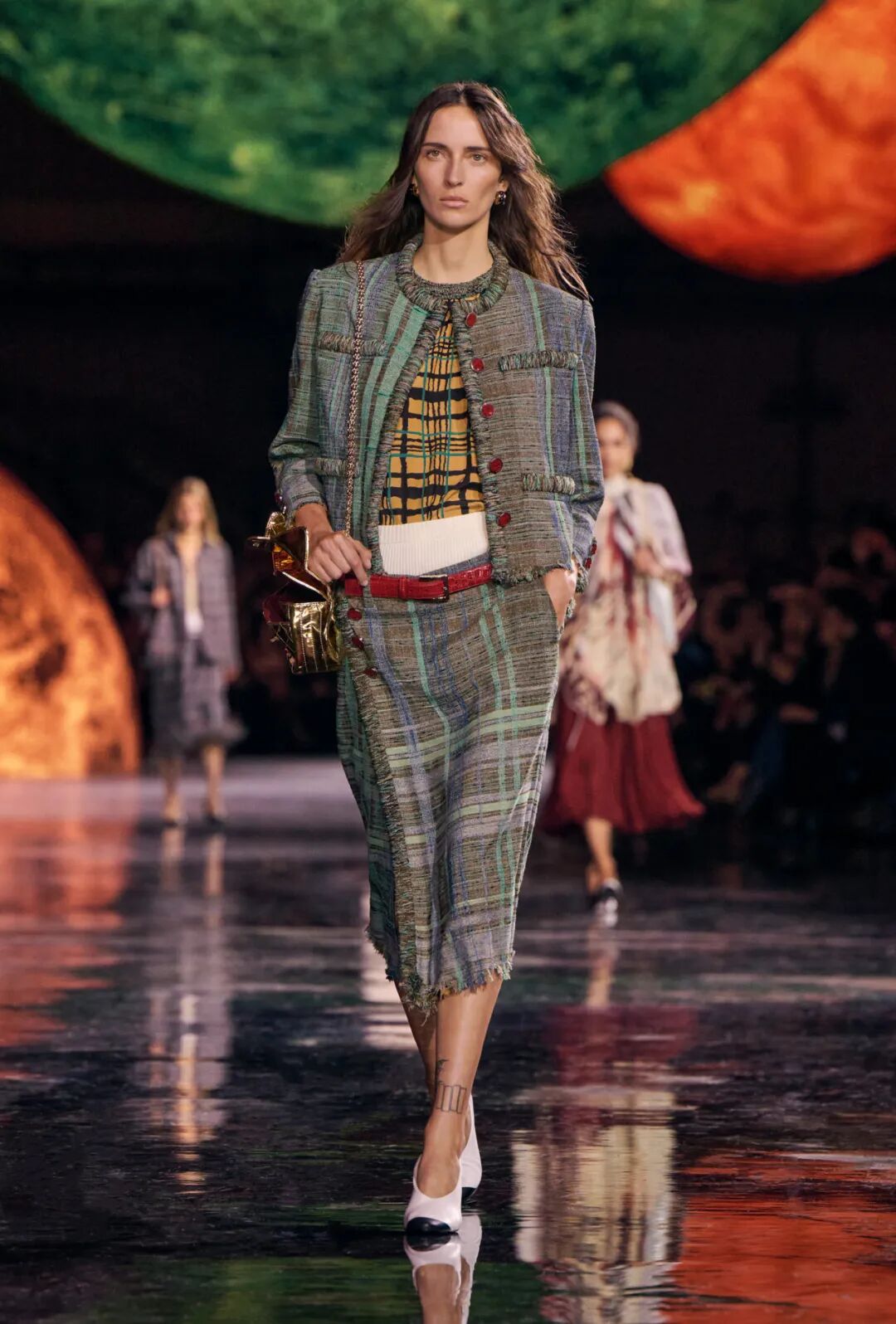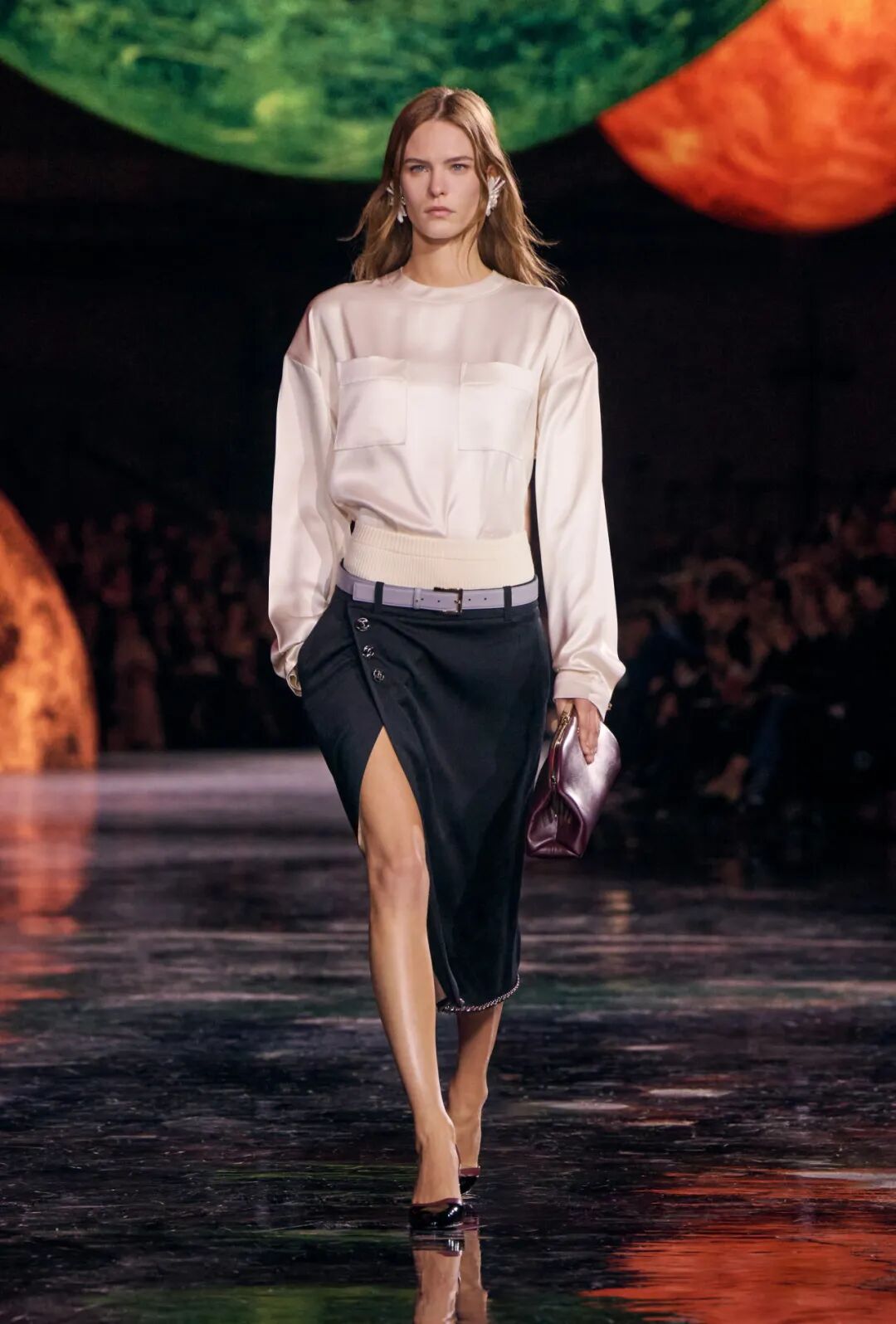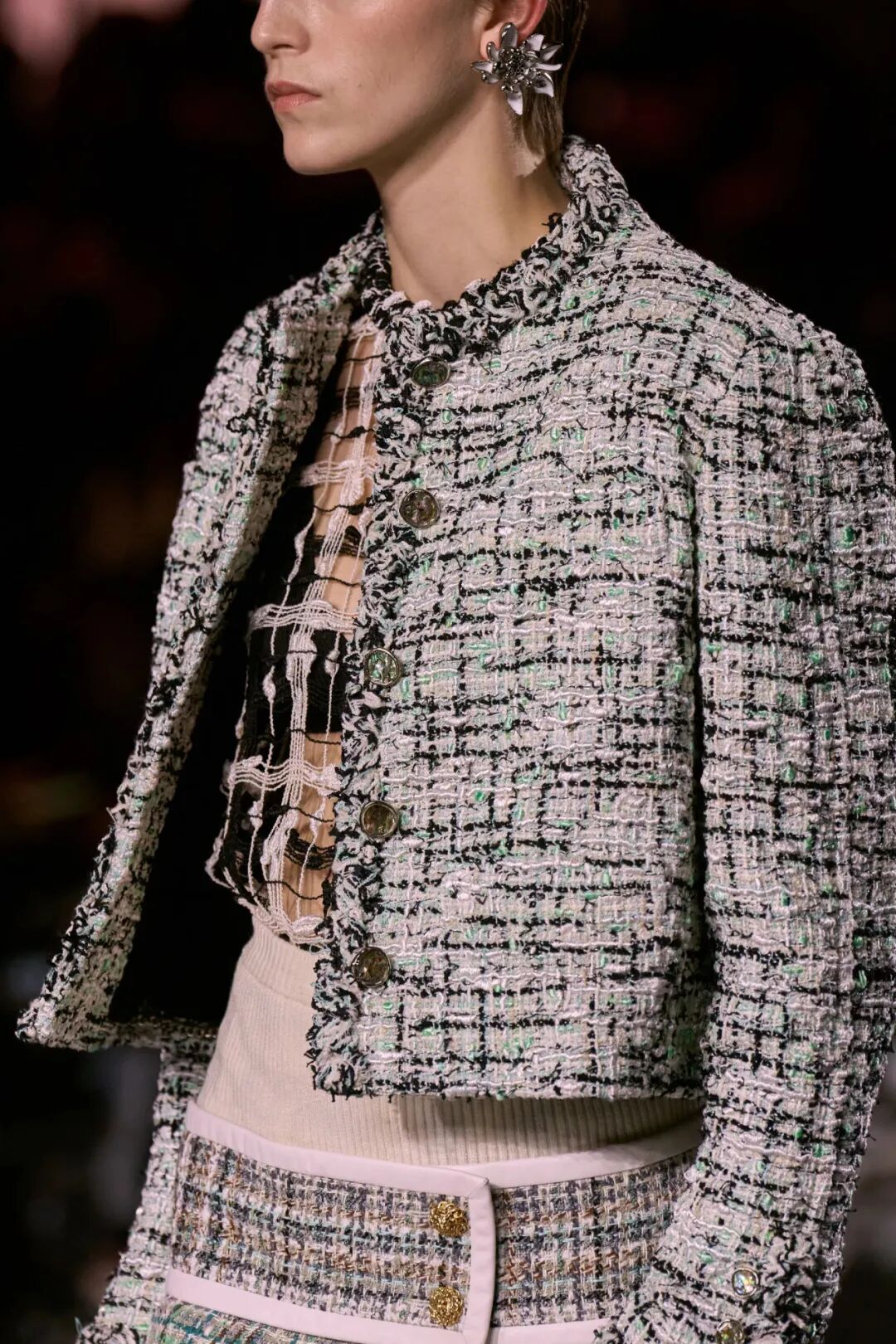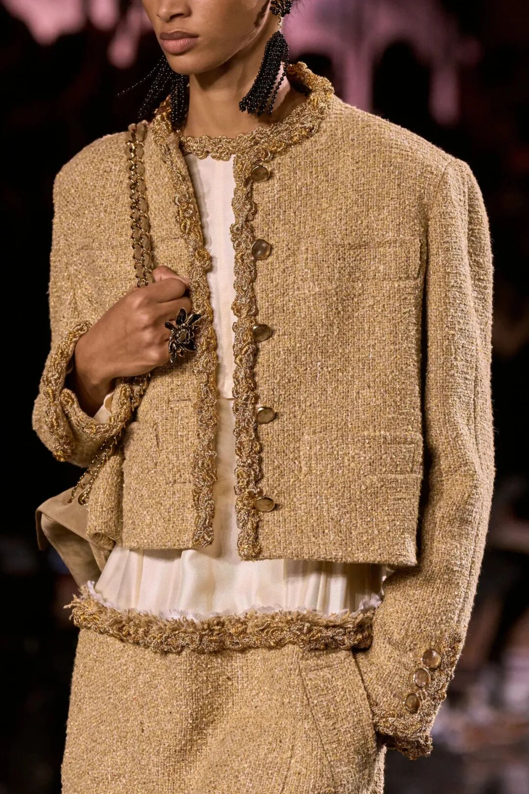 Matthieu Blazy加入CHANEL,这个品牌的时间开始以另一种方式流动。不是延续,也不是断裂,而是以一种更深层的重启——一种关于“如何在当下继续存在”的实验。从这一刻起,CHANEL的未来,不再被定义为“继承谁”而是“如何再次成为世界的一部分”。 2026春夏时装周,我们见证了十多位新创意总监的首秀,Matthieu Blazy的CHANEL首秀在这场“时尚大考”中终于“千呼万唤始出来”,让本季时装周以高潮收束,也让我们愈发感受到创意总监的更替,更像是一场时装范式转换——当许多奢侈品牌还沉迷于“遗产叙事”和“图案重组”时,Matthieu Blazy 把 CHANEL 拽回了现实。 Matthieu Blazy没有仅复刻经典,也没有只延续神话,他拔掉了品牌的安全插头,从“衣服”重新开始:面料、比例、重力、坠感。在一个被复古怀旧与社交媒体滤镜包裹的时代,几乎是一种反叛。 Blazy为整个奢侈品行业打开了一个全新的通道:设计师不必再做档案的守门人,也不必活在社交媒体的滤镜逻辑下。这也意味着接下来几年,大品牌们将不得不重新审视自己:继续卖符号,还是重新造语言? CHANEL 在这一刻,成为了那个临界点。Blazy 没有延续任何人的脚步,他正从零开始,为 CHANEL 构建了一个新的宇宙——一个关于重力、自由与未来的宇宙。 1. 背影的意义:Matthieu Blazy 与 CHANEL 的零重力时刻 那是一张几乎没有时间的照片。黑白的世界里,一个女人背对镜头,头发被剪成近乎几何的短波波头,末梢微微卷起,像羽毛在空气中轻颤。她的肩颈线裸露、细长,皮肤的亮度与背景的白几乎融为一体,唯一的界限是一道柔软的阴影。右上角,孤独的“双 C”悬浮着——像一颗行星,一种信号。 没有珍珠、没有香水、没有斜纹软呢,也没有那种惯常的法式姿态。她什么都没说,却什么都代表。 这便是 Matthieu Blazy 为 CHANEL 留下的第一张图像。由 David Bailey 拍摄,这张照片在公布后引起了短暂的静默——一种集体的屏息。它既不像广告,也不像预告,更像一记无声的宣言:CHANEL 的故事,将从“背影”重新开始。 这张背影既是隐喻,也是策略。它意味着他不打算以传统方式进入 CHANEL 的语言体系,而是先让它归零。那是一种“反品牌”的姿态:在一个被符号与记忆淹没的时代,他选择用沉默取代噪音。随后,品牌寄出了大秀邀请函——附上一条银色小房子吊坠项链。吊坠的形状是 康朋街31号 31 号,那座 CHANEL 的精神原点。俨然,这枚小吊坠与那张背影一样,暗示了一种行动:离开、重启、寻找新的引力。 当 Blazy 第一次走进 CHANEL 档案馆时,Blazy看见那些保存完好的样衣、缝线、刺绣样本、Karl Lagerfeld 的草图,全都散发着强烈的既视感——你需要一个梦想,讲故事,”(The Business of Fashion,2025,Para.23)。于是他停止前往档案馆,转而去读书——旧信件、早期访谈与传记。在文字中,他遇见了另一个 Gabrielle。 就在那段时间,Blazy 偶然看到几张 Gabrielle 穿着男式衬衫的老照片——宽松、洁白、未经造型,布料在她的身体上自然坠下,既中性又带着一种无意的性感。那一刻,他找到了线索。于是他与位于巴黎旺多姆广场的 Charvet 合作,重制了一系列衬衫。每件作品的内侧都缝着 “Tissu et technique par Charvet” 的标签,用 1920 年代 CHANEL 标签上略带颤动的手写字体刺绣。 这件衬衫成为他理解 CHANEL 的真正起点。它让他重新看见一种被遗忘的呼吸方式——一种从日常出发的自由。 在 Blazy 看来,或许那是 CHANEL 最本质的姿态:将私人情感转化为风格,将爱变成一种逃逸的可能。 而这场逃逸,在秀场上被放大成宇宙。 当晚,大皇宫的穹顶被改造成一个行星系统:十二颗不同颜色的星球缓缓旋转,地面漆成深蓝,光线游移如液体。Blazy 称之为“Universal(一个宇宙)”——一个无边的空间,象征 CHANEL 从巴黎出发,进入普世维度。 这些星球不是装饰,而是隐喻。红色代表激情与力量,铜色呼应 Gabrielle 的幸运符麦穗,乳白色由 LEMARIÉ山茶花及羽饰坊以羽饰拼制——柔软、脆弱,却永恒。每一颗星球都是一个时代的碎片,一段记忆的再生。 第一位模特走出——一件未封边的灰色西装外套,内衬针织布料,下搭宽松男裤,腰间露出轻微的松弛,这是一套在 CHANEL 语言下的西装。Blazy 将这一章节命名为 “Paradox(一个矛盾)”,在他看来,CHANEL 的魅力从不在完美,而在冲突:理性与欲望、秩序与反叛。 2. 从戏服到衣橱——剪刀落下的矛盾与白昼 当 Blazy 决定以 “Paradox” 开启这场旅程时,他真正想做的,不是展示一个主题,而是去揭开 CHANEL 的最初矛盾。那种在刚与柔、现实与幻想之间的张力,从 Gabrielle 开始,就从未停止过。她既是那个打破束缚的现代女性,又是浪漫情感的囚徒;既渴望像男人一样自由,又从不否认女性的诱惑力。Blazy 在这一幕中,回到了这个最原始的矛盾,并让它重新闪光。 “她说过,‘没有时间做一成不变的事,工作需要时间,爱情需要时间,就没有时间做其他的了。 ’”Blazy 在采访中重复这句话时,神情专注,几乎像在自我提醒。 在试装的第一天,他拿起自己的西装外套,现场剪下领口,重新裁到 CHANEL 的比例。所有人都屏息,工作室的空气瞬间凝固。那件粗粝、未处理的外套,带有男性肩线的灰色夹克,边缘依旧保留着生硬的剪口,与开叉半裙搭配,重量由一条细链固定在下摆处——CHANEL 经典外套的隐形结构,也被保留了下来。它既是 Gabrielle 的,也是 Matthieu 的。 “那就是矛盾本身,”