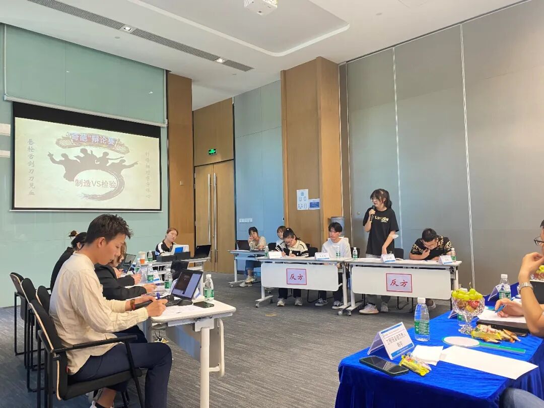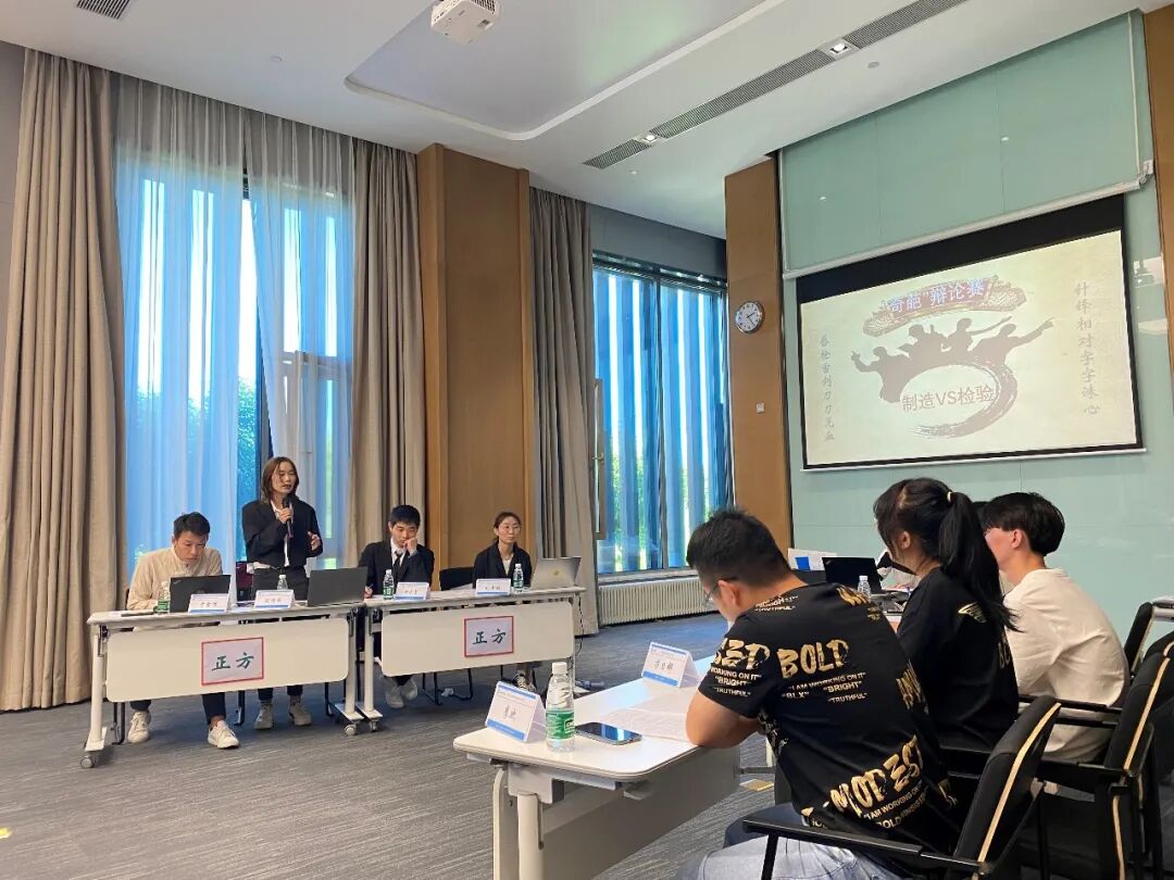 本次辩论赛由一辩陈述、二三辩攻辩、全员自由辩、四辩总结陈词四个环节组成。赛场气氛自主持人宣布开始的那一刻起就变得紧张又激烈,辩手们围绕质量究竟是制造出来的还是检验出来的,正方选手针对质量管理是制造出来的一一罗列引蛇出洞;反方也不甘示弱,紧扣正方所犯的逻辑错误借力打击。