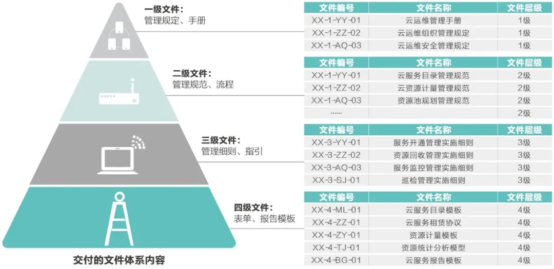 运维管理流程体系建设成果以文档资料的形式发布,该成果文档资料可以按照四级分档明确分类,内容全面,可涵盖日常运维交付的工作所需。