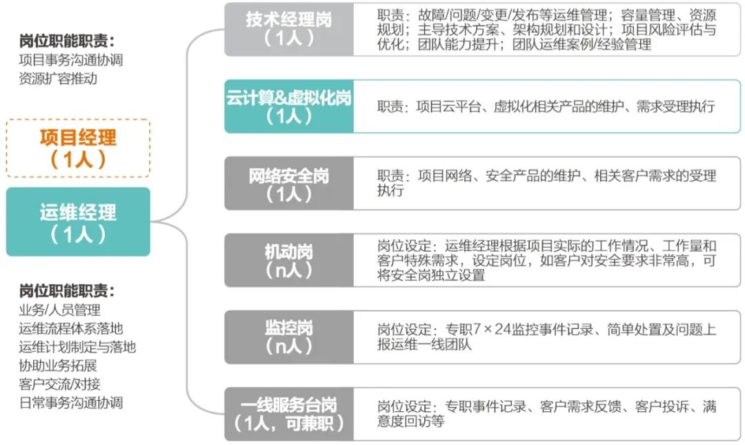 在政务云运维场景下,运维组织的建设是受多方面考虑和约束的,如人员编制、预算投入、SLA要求、7×24监控需求等,这些因素制约着现场运维团队的岗位设置。
