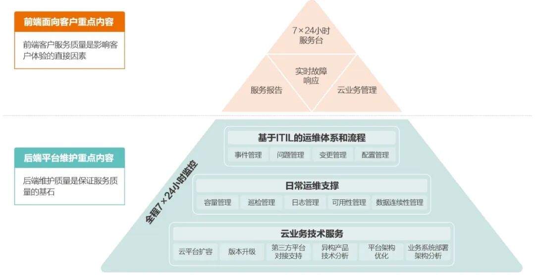 此项目为云服务运营模式,所以整个运维分前端面向客户的内容、后端平台维护的内容,前后端通过运维经理的统筹协调和管理,保障SLA的达成,助力运营推广和项目营收目标达成。