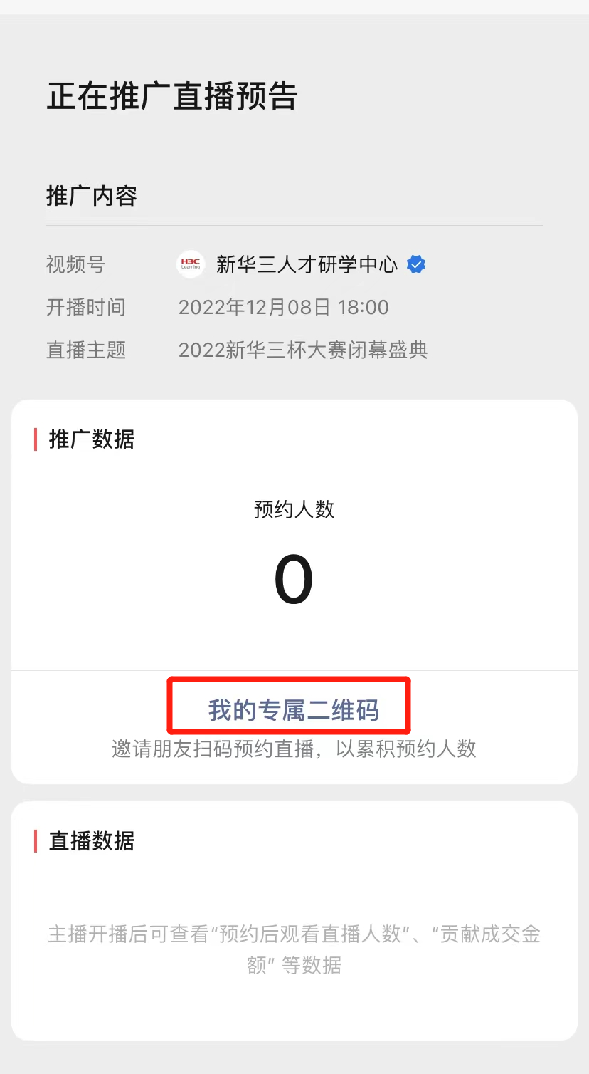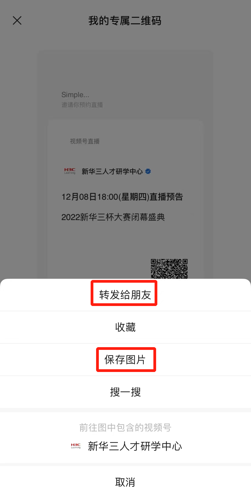 第三步:长按“我的专属二维码”,即可转发给朋友或保存图片分享至朋友圈,邀请他人预约直播