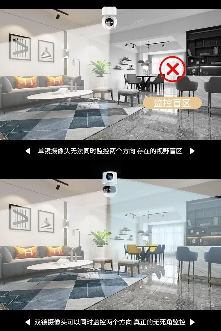 它采用革命性双广角镜头设计,由超大广角的固定镜头和360°视角的移动镜头组成,可以实现同时监控两个区域,彻底消除视野盲区,确保每一寸空间尽在掌握。