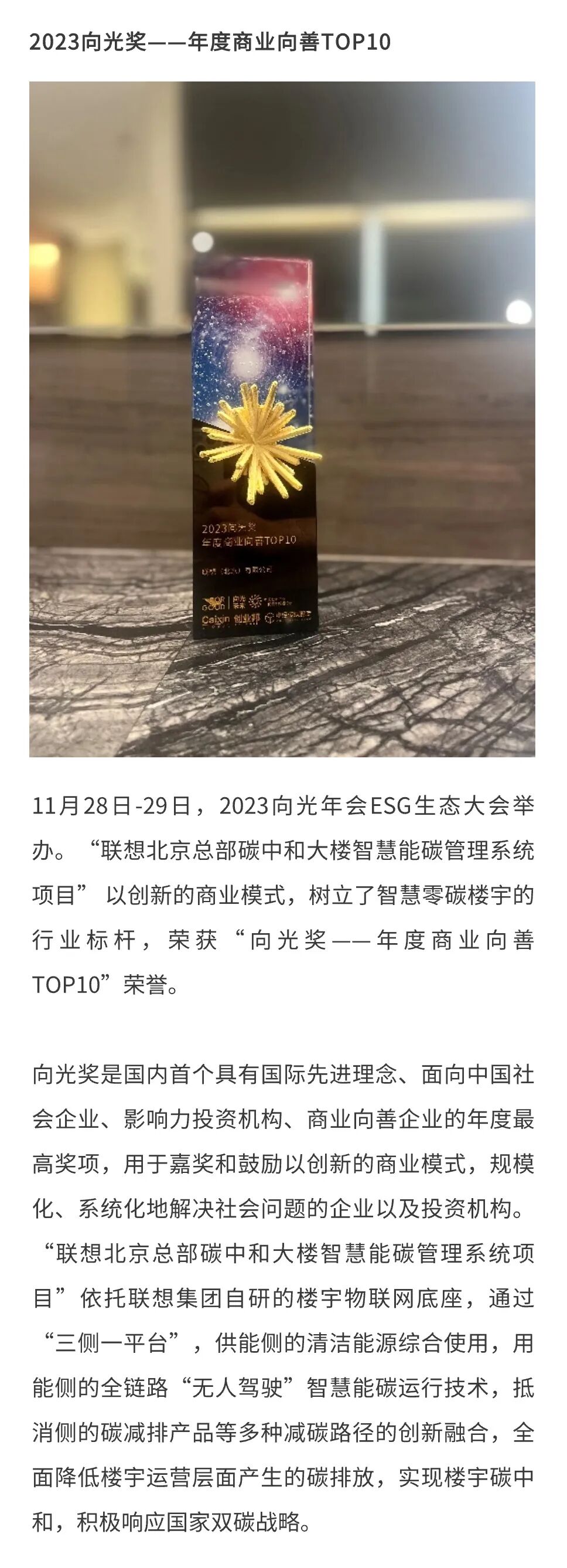 从运用AI技术赋能乡村教育智能化,到打造零碳产品撬动行业绿色升级;从发挥链主作用引领产业链协同降碳,到坚定贯彻新发展理念,以科技创新推动高质量发展。九项大奖印证着联想在创造社会价值中的实干与担当,更证明了产业各界对联想ESG实践的广泛认可。
