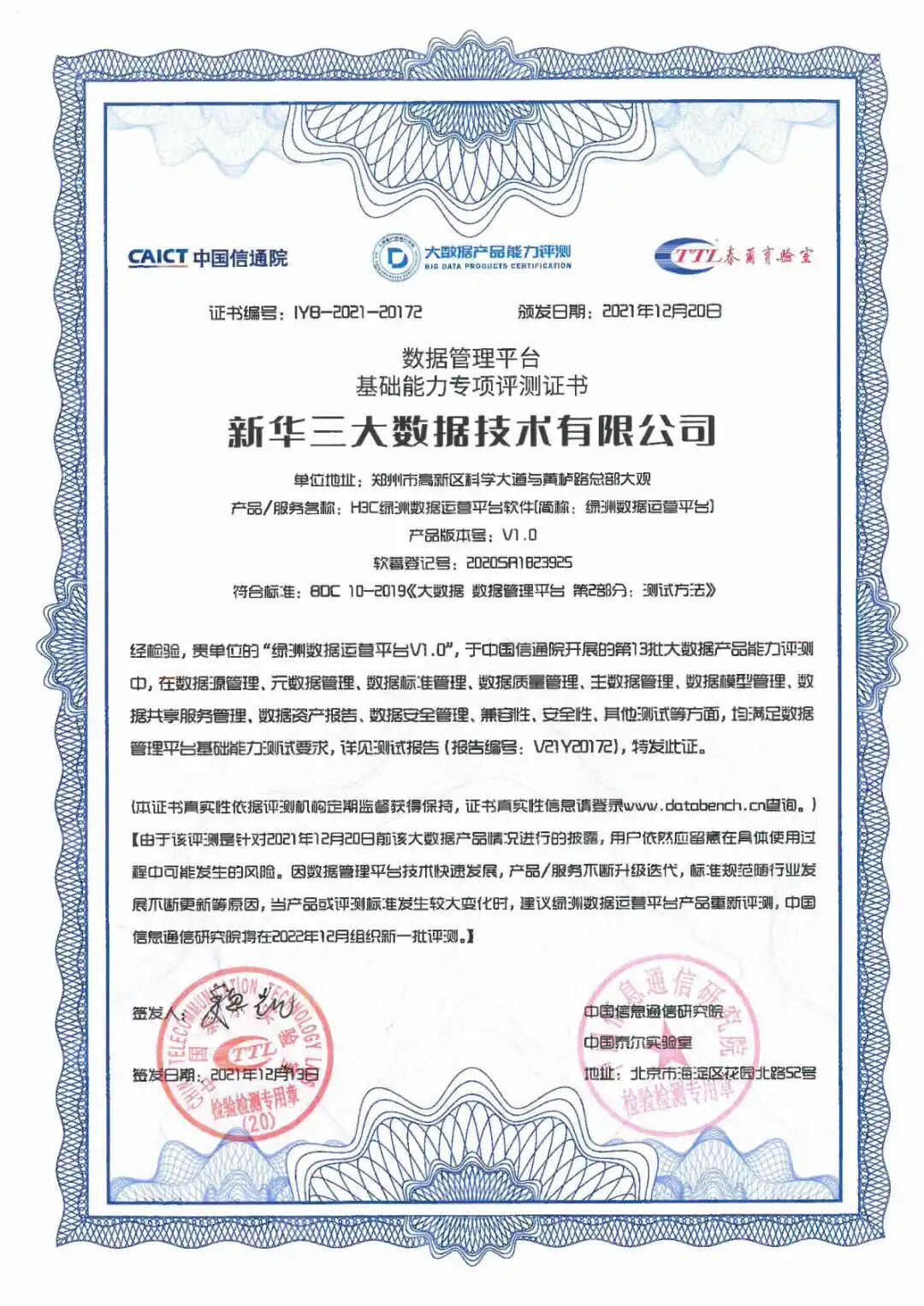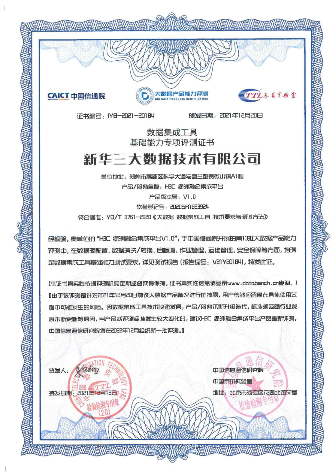 2021年12月20日,2021数据资产管理大会在线上成功举办,中国信息通信研究院(以下简称“中国信通院”)对第十三批大数据产品能力评测结果进行了颁布。紫光旗下新华三集团(以下简称“新华三”)绿洲平台三款产品——融合集成平台、数据运营平台和AIOS人工智能平台,凭借卓越的产品特性,分别以优异的成绩通过数据集成工具、数据管理平台和数据挖掘平台基础能力专项评测。