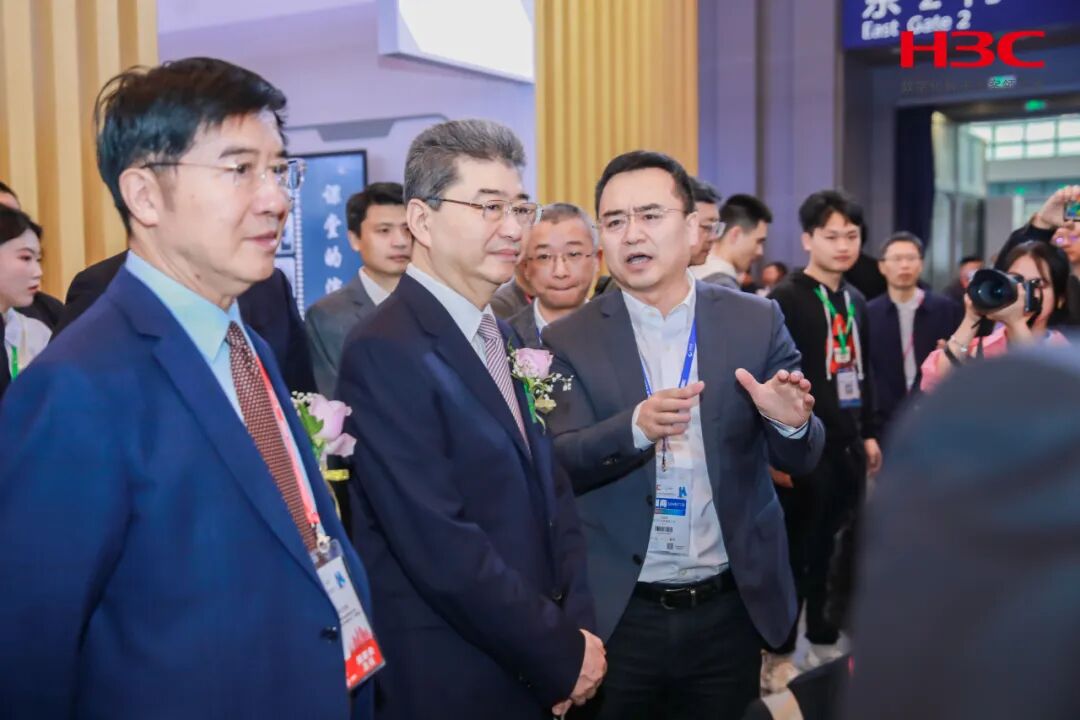 教育部副部长吴岩,中国高等教育学会会长杜玉波,国家教育行政学院副院长王治军等领导莅临新华三集团参观指导,实地了解在智慧教育领域的领先技术和实力。教育部副部长吴岩(中)、中国高等教育学会会长杜玉波(左一)参观新华三展区