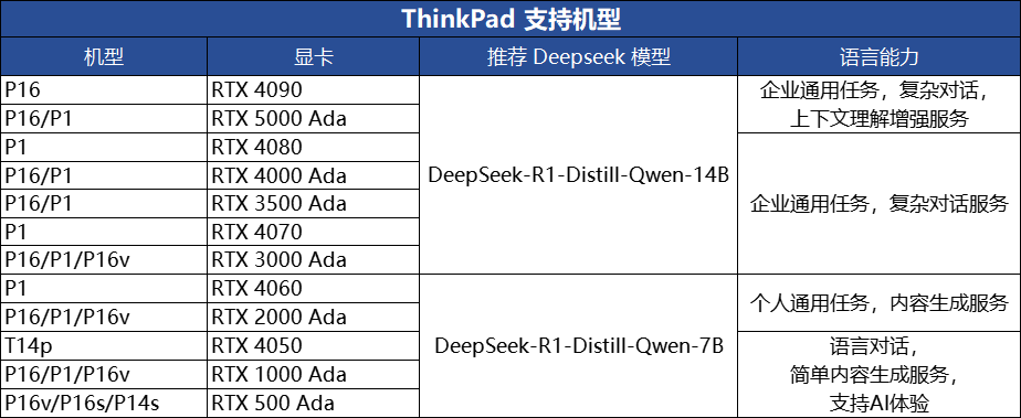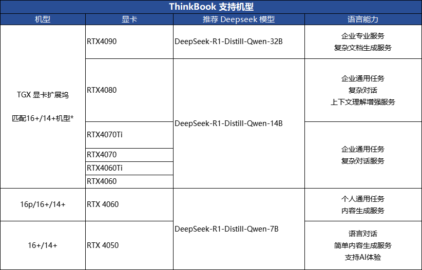 本次DeepSeek本地版上门安装服务覆盖了Think家族中的独显机型,涵盖ThinkPad、ThinkBook、ThinkCentre三大品牌系列。