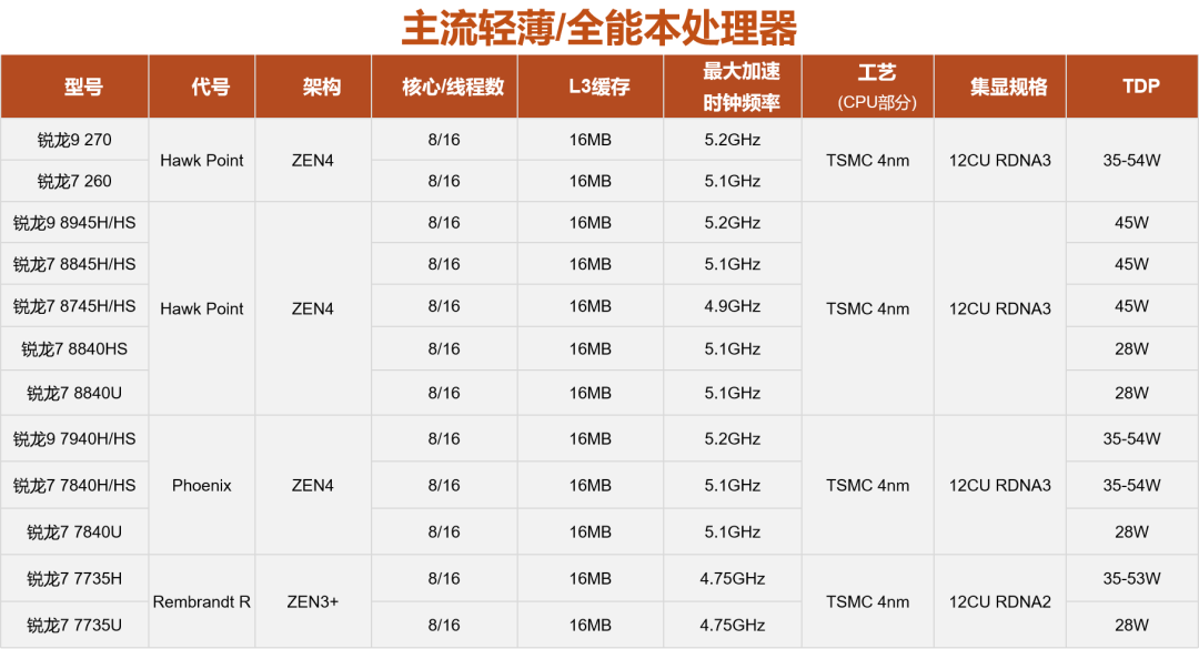 该系列包含H/HS/U后缀结尾,以架构为Zen4和Zen3+区分,除锐龙7 7735H和锐龙7 7735U处理器外大多为Ryzen 7 7840H/HS Phoenix的衍生品。