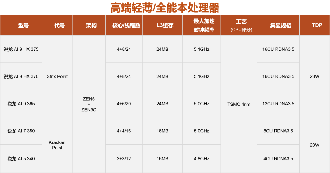 采用同构大小核结构,小核架构与大核完全一致,性能更强。像Ryzen Al 9 HX 375、Ryzen Al 9 HX 370等型号。