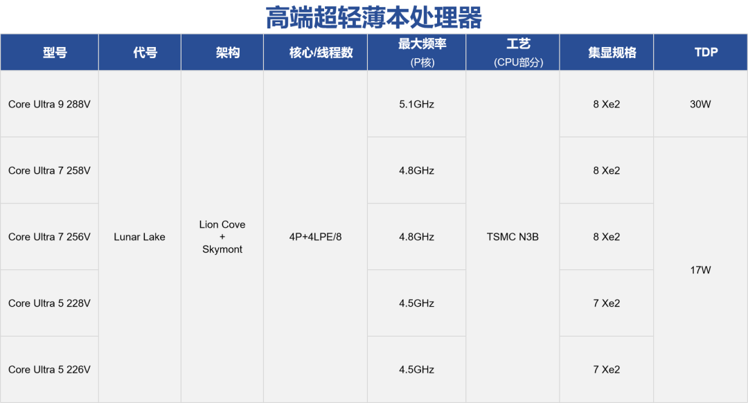 该系列采用MoP内存架构和PMIC供电,通过更精细的频率及调度优化实现超长续航,集显也有较大升级,可应对轻度娱乐需求。例如Core Ultra 9 288V、Core Ultra 7 258V等型号。