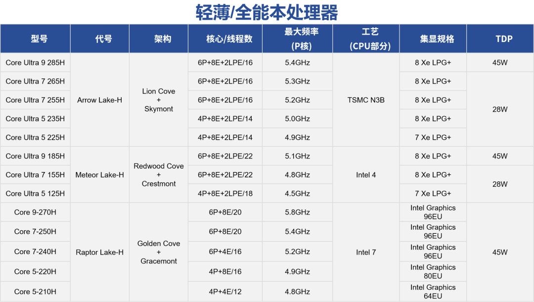 该系列注重性能与功耗的平衡,具备中等性能和中等功耗,能提供中长续航。例如Core Ultra 9 285H、Core Ultra 7 265H等。