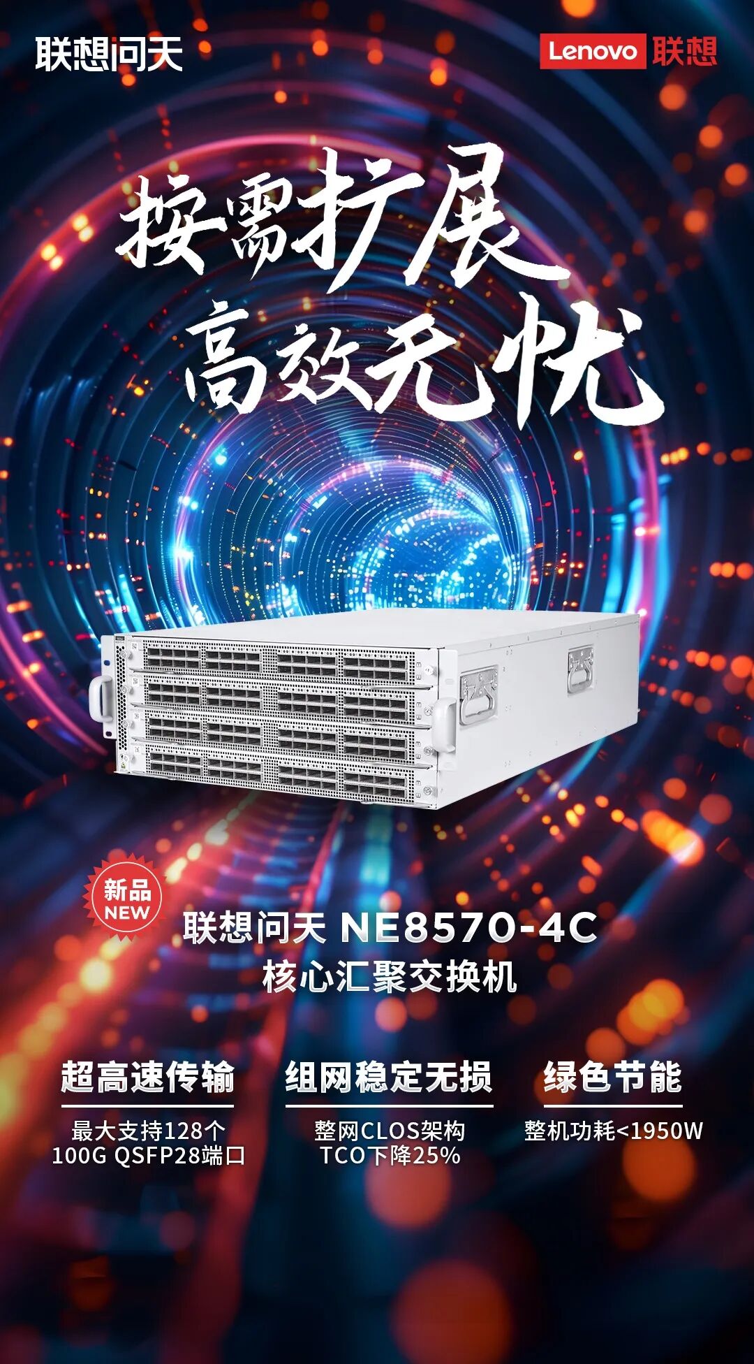 经过实测,联想问天NE8570-4C核心交换机部署之后,硬件成本降低47%、电力成本降低71%、空间占用节省一半机柜空间,空间成本降低24%。另外,由于NE8570-4C绿色低碳特性,数据中心上线时不涉及改电等前期工作,上线周期相比框式产品缩短80%。在日新月异的AI发展浪潮中,有力提升了数据中心及企业的竞争优势。