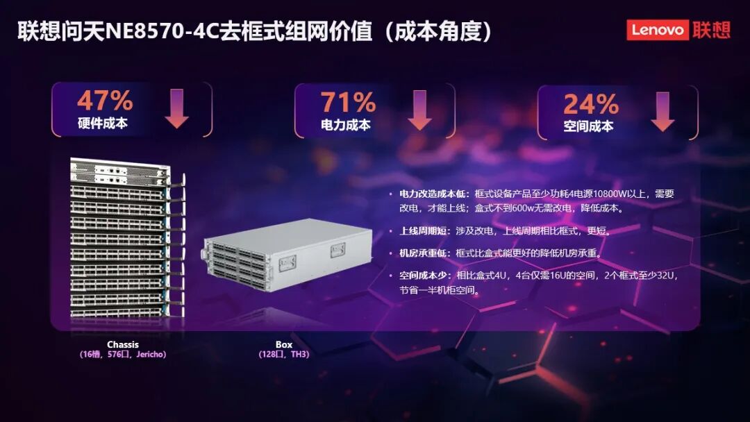 而且联想问天NE8570-4C交换机还是一款高性价比的交换机,在硬件成本上可节约47%,用电成本上节约71%。另外,因为去框式,还可以带来24%的空间节省。