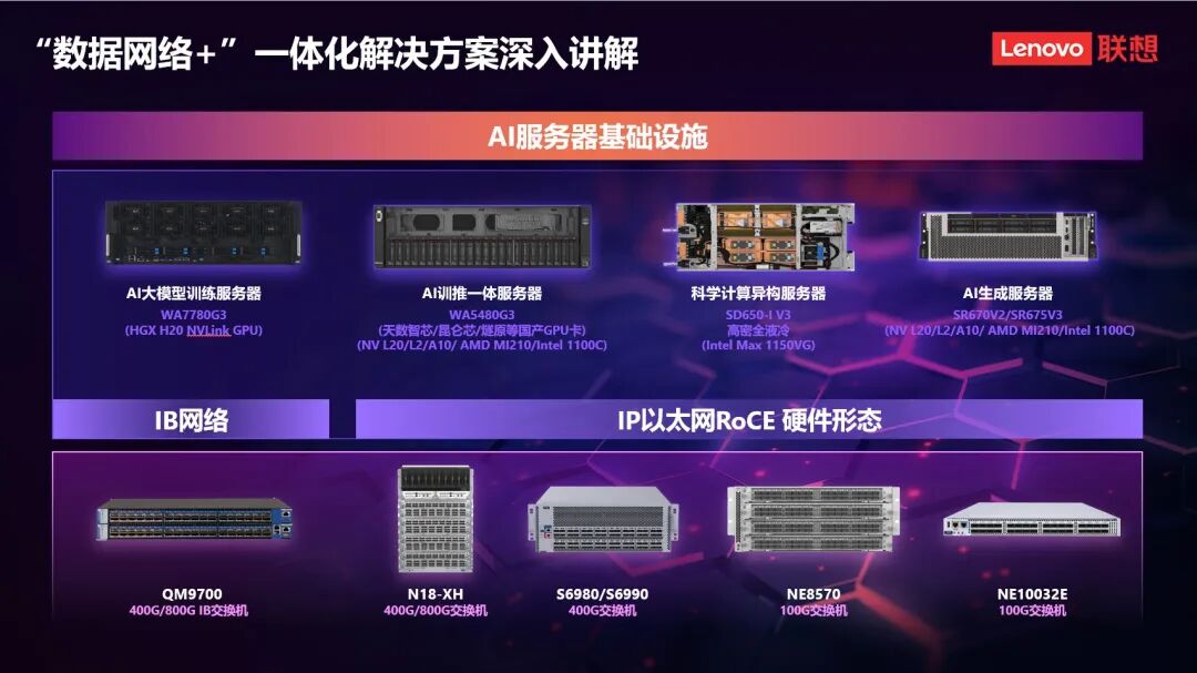 在智算数据中心的建设上,联想不只是关注网络产品本身,还在算力侧同步发力,通过算网融合为智算应用赋能。针对当前火爆的AI市场,联想有三款主力AI服务器,分别是面向大模型训练的联想问天WA7780 G3、训推一体的联想问天WA5480 G3、面向推理的联想问天WA5220 G3。这几款AI服务器分别针对主要面对的应用场景进行了针对性的优化。