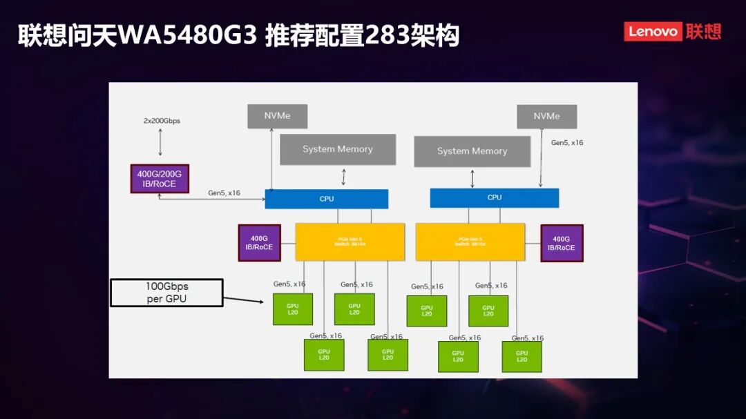 要充分释放AI服务器的算力潜能,需要配置合适的网络架构。针对联想问天WA5480 G3,联想推荐采用“283架构”,即2颗CPU、8张GPU卡、3张网卡的配置。其中,2张400G的IB或者RoCE网卡负责东西向的数据交换,一张400G或者200G的IB或者RoCE网卡负责南北向的数据传输。