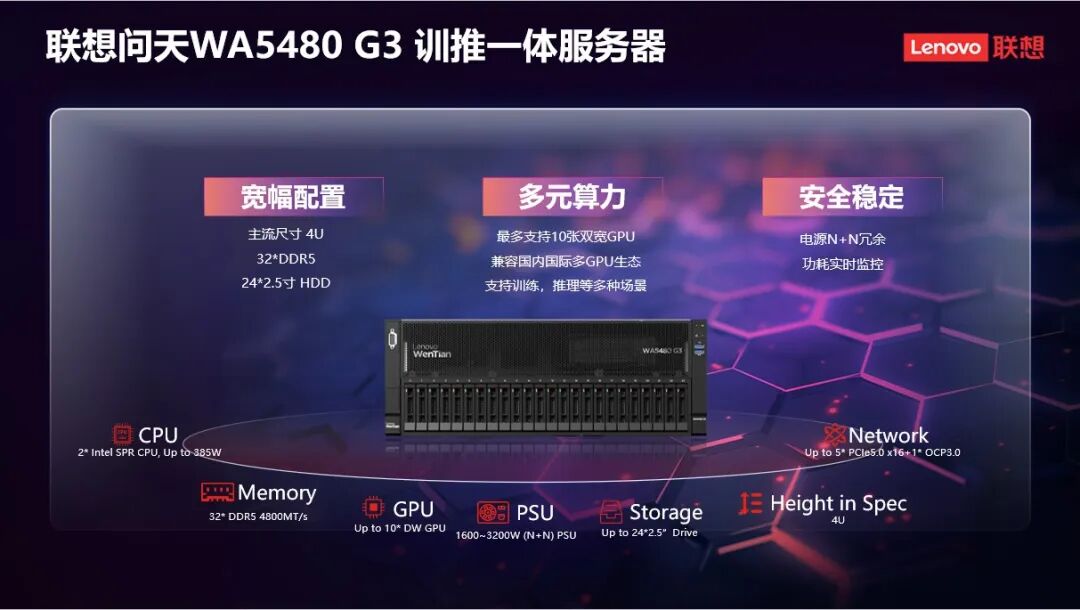 以联想问天WA5480 G3为例,宽幅配置,单台支持24块2.5寸硬盘,最多支持10张双宽GPU,而且兼容国产GPU。比如,可以搭配国产沐曦C500和天垓150 GPU以及英伟达L20等满足训推一体的需求,也可以搭配国产沐曦C500或者AMD MI308用于HPC传统场景,还可以搭配摩尔S3000进行图形渲染。