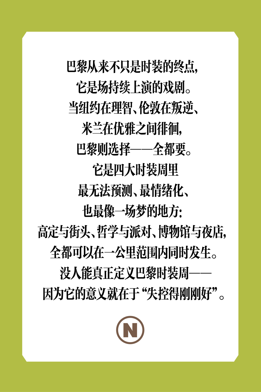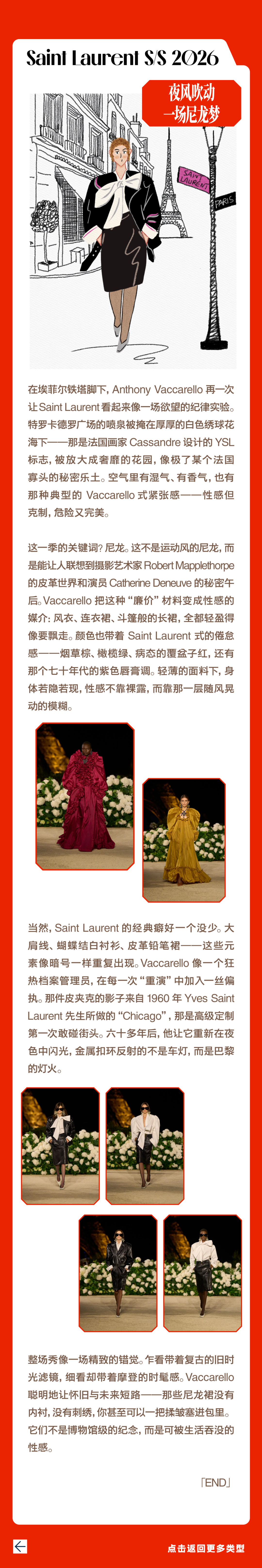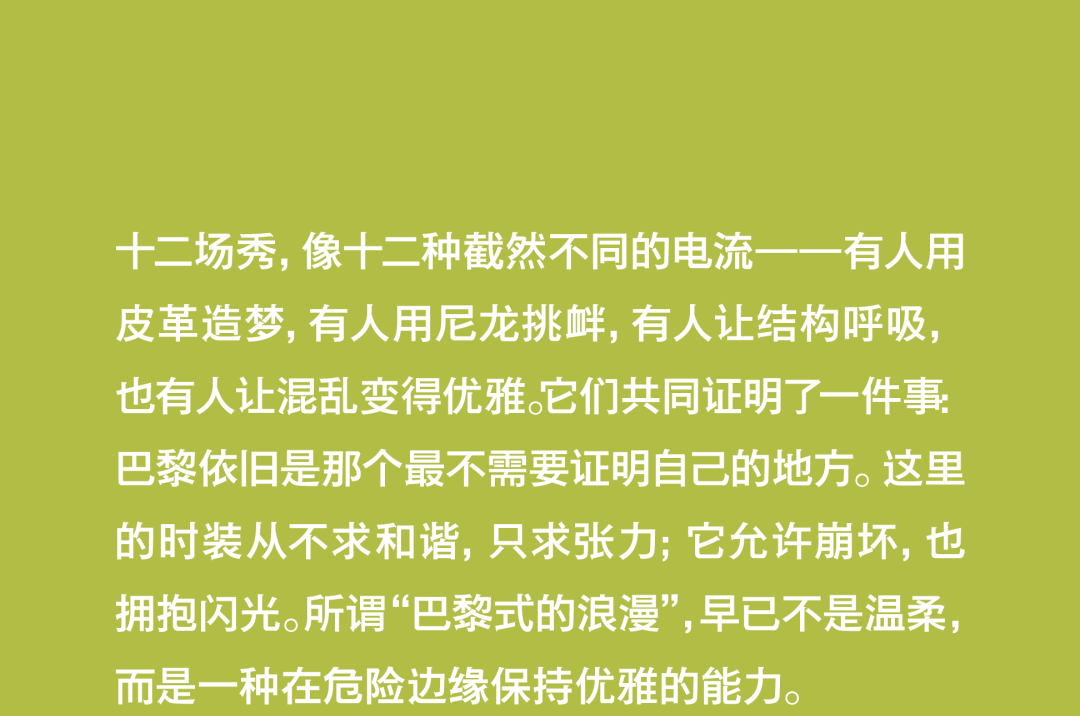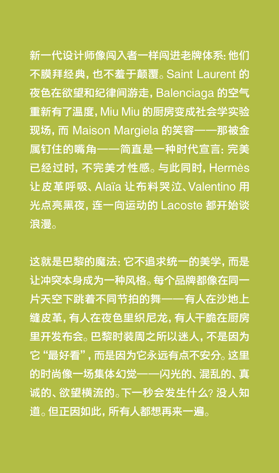 巴黎从来不只是时装的终点,它是场持续上演的戏剧。当纽约在理智、伦敦在叛逆、米兰在优雅之间徘徊,巴黎则选择——全都要。它是四大时装周里最无法预测、最情绪化、也最像一场梦的地方:高定与街头、哲学与派对、博物馆与夜店,全都可以在一公里范围内同时发生。没人能真正定义巴黎时装周——因为它的意义就在于“失控得刚刚好”。 这一季尤为如此。新一代设计师像闯入者一样闯进老牌体系:他们不膜拜经典,也不羞于颠覆。Saint Laurent的夜色在欲望和纪律间游走,Balenciaga的空气重新有了温度,Miu Miu的厨房变成社会学实验现场,而Maison Margiela的笑容——那被金属钉住的嘴角——简直是一种时代宣言:完美已经过时,不完美才性感。与此同时,Hermès让皮革呼吸、Alaïa让布料哭泣、Valentino用光点亮黑夜,连一向运动的Lacoste都开始谈浪漫。 这就是巴黎的魔法:它不追求统一的美学,而是让冲突本身成为一种风格。每个品牌都像在同一片天空下跳着不同节拍的舞——有人在沙地上缝皮革,有人在夜色里织尼龙,有人干脆在厨房里开发布会。巴黎时装周之所以迷人,不是因为它“最好看”,而是因为它永远有点不安分。这里的时尚像一场集体幻觉——闪光的、混乱的、真诚的、欲望横流的。下一秒会发生什么?没人知道。但正因如此,所有人都想再来一遍。 Saint Laurent:夜风吹动一场尼龙梦 在埃菲尔铁塔脚下,Anthony Vaccarello再一次让Saint Laurent看起来像一场欲望的纪律实验。特罗卡德罗广场的喷泉被掩在厚厚的白色绣球花海下——那是法国画家Cassandre设计的YSL标志,被放大成奢靡的花园,像极了某个法国寡头的秘密乐土。空气里有湿气、有香气,也有那种典型的Vaccarello式紧张感——性感但克制,危险又完美。 这一季的关键词?尼龙。这不是运动风的尼龙,而是能让人联想到摄影师Robert Mapplethorpe的皮革世界和演员Catherine Deneuve的秘密午后。Vaccarello把这种“材料变成性感的媒介:风衣、连衣裙、斗篷般的长裙,全都轻盈得像要飘走。颜色也带着Saint Laurent式的倦怠感——烟草棕、橄榄绿、病态的覆盆子红,还有那个七十年代的紫色唇膏调。轻薄的面料下,身体若隐若现,性感不靠裸露,而靠那一层随风晃动的模糊。 当然,Saint Laurent的经典癖好一个没少。大肩线、蝴蝶结白衬衫、皮革铅笔裙——这些元素像暗号一样重复出现。Vaccarello像一个狂热档案管理员,在每一次“重演”中加入一丝偏执。那件皮夹克的影子来自1960年Saint Laurent为Dior做的“Chicago”,那是高级定制第一次敢碰街头。六十多年后,他让它重新在夜色中闪光,金属扣环反射的不是车灯,而是巴黎的灯火。 整场秀像一场精致的错觉。乍看之下复古得要命,细看却轻得像像素。Vaccarello聪明地让怀旧与未来短路——那些尼龙裙没有内衬,没有刺绣,你甚至可以一把揉皱塞进包里。它们不是博物馆级的纪念,而是可被生活吞没的性感。 Miu Miu:当时尚回到厨房那块抹布上 这季的Miu Miu很不“娇气”。Miuccia Prada把秀场变成了一个格外时髦的工厂食堂,让演员Sandra Hüller一脸严肃地在彩色福米卡桌间穿行,像是在给午餐会点名。时间是下午两点半,地点似乎在每个人的脑海里都能找到对照——公司食堂、家里厨房、或者某个开在东柏林的社群面包坊。标题叫“At Work”,但显然Miuccia并不是在鼓励大家打卡上班,而是在提醒:劳动的样子,也可以是优雅的。 说到底,Miuccia女士一直是个对“有用”上瘾的女人。她讨厌空洞的时髦,也不信任那些没有功能性的“姿态”。在她眼里,时装不是梦境,是工作。所以她干脆用最平凡的服装符号——围裙,把关于女性、关于劳动、关于意义的思考,变成一场看似轻盈、其实尖锐的表演。 结果呢?社交媒体炸了。社交网络上一堆男孩女孩开始在厨房套上围裙自拍,有人模仿模特们的步伐,有人用IKEA袋子DIY那条围裙。最夸张的还有人穿着花布罩衫去上班,自称“办公室女工版Miu Miu”。评论区一半人在笑说“高级的女佣制服”,另一半则愤怒地指责Miuccia在“戏弄劳动人民”。——显然,他们都没懂。 Miuccia从来不取笑“劳动”,她取笑的是无意义的时髦。她对“有用”的痴迷几乎是哲学级的执念。从工厂制服、护士服、家庭围裙,到那些在厨房、医院、学校中出现的布料——她重新赋予它们存在的尊严。 这一季,她让这些衣服“反叛”:斜纹布与皮革碰撞蕾丝与丝质浮雕;那些本该油渍斑斑的工作围裙,被包裹上闪光珠绣,像是一种对“女性劳动”的奖章。看起来在打趣,其实在还礼。 如果Prada的母品牌是智性冷调的“哲学实验室”,那Miu Miu就是带着粉色指甲油的“社会评论剧场”。在“后社交媒体时代”,她早就明白时尚话题的热度来自“被误解”。于是她主动拥抱这种误解——把平凡的围裙送上伸展台,逼大家去想:当我们为一条牛仔裤的破洞付出两倍价格时,我们到底在买什么?当一件制服被重新定义为“高级时尚”,谁才是真正的劳动者?一百年后,Prada把厨房的围裙带进了巴黎时装周。而这个动作,比任何浮夸的概念装置都更具颠覆性:她没有在贩卖贫穷的浪漫,而是在让“劳动”重新闪光。 说实话,这场秀的服装难穿吗?当然——谁会真的穿着双层围裙去开会?但时尚的意义从来不在“穿出去”,而在“想进去”。Prada一直擅长用极度“普通”的东西制造思考的张力:她曾让阿姨的尼龙