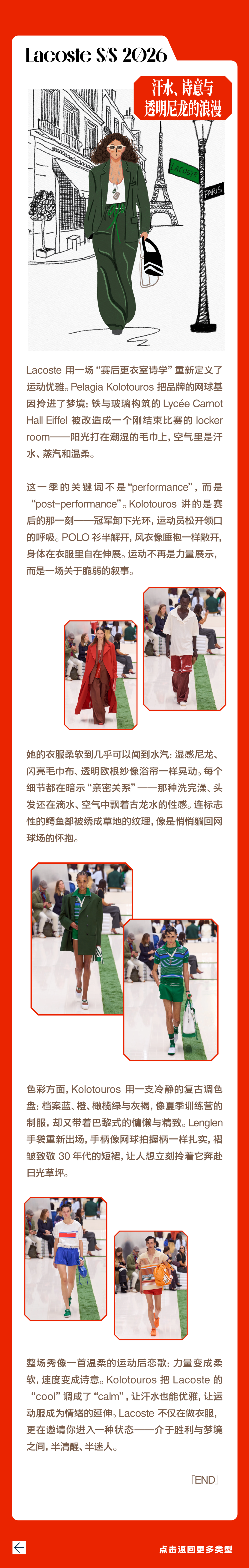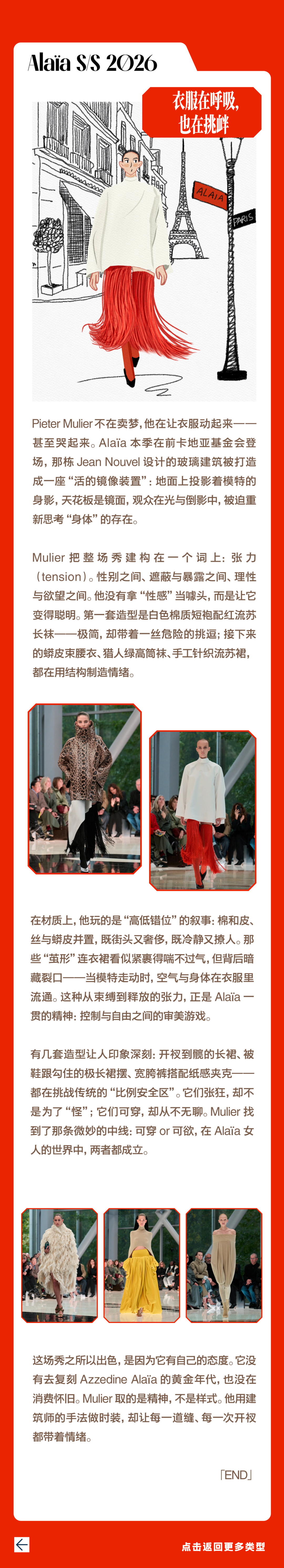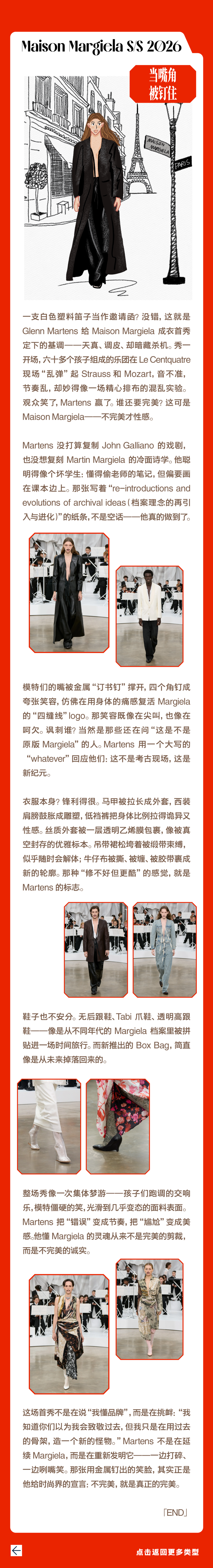 巴黎从来不只是时装的终点,它是场持续上演的戏剧。当纽约在理智、伦敦在叛逆、米兰在优雅之间徘徊,巴黎则选择——全都要。它是四大时装周里最无法预测、最情绪化、也最像一场梦的地方:高定与街头、哲学与派对、博物馆与夜店,全都可以在一公里范围内同时发生。没人能真正定义巴黎时装周——因为它的意义就在于“失控得刚刚好”。 这一季尤为如此。新一代设计师像闯入者一样闯进老牌体系:他们不膜拜经典,也不羞于颠覆。Saint Laurent的夜色在欲望和纪律间游走,Balenciaga的空气重新有了温度,Miu Miu的厨房变成社会学实验现场,而Maison Margiela的笑容——那被金属钉住的嘴角——简直是一种时代宣言:完美已经过时,不完美才性感。与此同时,Hermès让皮革呼吸、Alaïa让布料哭泣、Valentino用光点亮黑夜,连一向运动的Lacoste都开始谈浪漫。 这就是巴黎的魔法:它不追求统一的美学,而是让冲突本身成为一种风格。每个品牌都像在同一片天空下跳着不同节拍的舞——有人在沙地上缝皮革,有人在夜色里织尼龙,有人干脆在厨房里开发布会。巴黎时装周之所以迷人,不是因为它“最好看”,而是因为它永远有点不安分。这里的时尚像一场集体幻觉——闪光的、混乱的、真诚的、欲望横流的。下一秒会发生什么?没人知道。但正因如此,所有人都想再来一遍。 Saint Laurent:夜风吹动一场尼龙梦 在埃菲尔铁塔脚下,Anthony Vaccarello再一次让Saint Laurent看起来像一场欲望的纪律实验。特罗卡德罗广场的喷泉被掩在厚厚的白色绣球花海下——那是法国画家Cassandre设计的YSL标志,被放大成奢靡的花园,像极了某个法国寡头的秘密乐土。空气里有湿气、有香气,也有那种典型的Vaccarello式紧张感——性感但克制,危险又完美。 这一季的关键词?尼龙。这不是运动风的尼龙,而是能让人联想到摄影师Robert Mapplethorpe的皮革世界和演员Catherine Deneuve的秘密午后。Vaccarello把这种“材料变成性感的媒介:风衣、连衣裙、斗篷般的长裙,全都轻盈得像要飘走。颜色也带着Saint Laurent式的倦怠感——烟草棕、橄榄绿、病态的覆盆子红,还有那个七十年代的紫色唇膏调。轻薄的面料下,身体若隐若现,性感不靠裸露,而靠那一层随风晃动的模糊。 当然,Saint Laurent的经典癖好一个没少。大肩线、蝴蝶结白衬衫、皮革铅笔裙——这些元素像暗号一样重复出现。Vaccarello像一个狂热档案管理员,在每一次“重演”中加入一丝偏执。那件皮夹克的影子来自1960年Saint Laurent为Dior做的“Chicago”,那是高级定制第一次敢碰街头。六十多年后,他让它重新在夜色中闪光,金属扣环反射的不是车灯,而是巴黎的灯火。 整场秀像一场精致的错觉。乍看之下复古得要命,细看却轻得像像素。Vaccarello聪明地让怀旧与未来短路——那些尼龙裙没有内衬,没有刺绣,你甚至可以一把揉皱塞进包里。它们不是博物馆级的纪念,而是可被生活吞没的性感。 Miu Miu:当时尚回到厨房那块抹布上 这季的Miu Miu很不“娇气”。Miuccia Prada把秀场变成了一个格外时髦的工厂食堂,让演员Sandra Hüller一脸严肃地在彩色福米卡桌间穿行,像是在给午餐会点名。时间是下午两点半,地点似乎在每个人的脑海里都能找到对照——公司食堂、家里厨房、或者某个开在东柏林的社群面包坊。标题叫“At Work”,但显然Miuccia并不是在鼓励大家打卡上班,而是在提醒:劳动的样子,也可以是优雅的。 说到底,Miuccia女士一直是个对“有用”上瘾的女人。她讨厌空洞的时髦,也不信任那些没有功能性的“姿态”。在她眼里,时装不是梦境,是工作。所以她干脆用最平凡的服装符号——围裙,把关于女性、关于劳动、关于意义的思考,变成一场看似轻盈、其实尖锐的表演。 结果呢?社交媒体炸了。社交网络上一堆男孩女孩开始在厨房套上围裙自拍,有人模仿模特们的步伐,有人用IKEA袋子DIY那条围裙。最夸张的还有人穿着花布罩衫去上班,自称“办公室女工版Miu Miu”。评论区一半人在笑说“高级的女佣制服”,另一半则愤怒地指责Miuccia在“戏弄劳动人民”。——显然,他们都没懂。 Miuccia从来不取笑“劳动”,她取笑的是无意义的时髦。她对“有用”的痴迷几乎是哲学级的执念。从工厂制服、护士服、家庭围裙,到那些在厨房、医院、学校中出现的布料——她重新赋予它们存在的尊严。 这一季,她让这些衣服“反叛”:斜纹布与皮革碰撞蕾丝与丝质浮雕;那些本该油渍斑斑的工作围裙,被包裹上闪光珠绣,像是一种对“女性劳动”的奖章。看起来在打趣,其实在还礼。 如果Prada的母品牌是智性冷调的“哲学实验室”,那Miu Miu就是带着粉色指甲油的“社会评论剧场”。在“后社交媒体时代”,她早就明白时尚话题的热度来自“被误解”。于是她主动拥抱这种误解——把平凡的围裙送上伸展台,逼大家去想:当我们为一条牛仔裤的破洞付出两倍价格时,我们到底在买什么?当一件制服被重新定义为“高级时尚”,谁才是真正的劳动者?一百年后,Prada把厨房的围裙带进了巴黎时装周。而这个动作,比任何浮夸的概念装置都更具颠覆性:她没有在贩卖贫穷的浪漫,而是在让“劳动”重新闪光。 说实话,这场秀的服装难穿吗?当然——谁会真的穿着双层围裙去开会?但时尚的意义从来不在“穿出去”,而在“想进去”。Prada一直擅长用极度“普通”的东西制造思考的张力:她曾让阿姨的尼龙