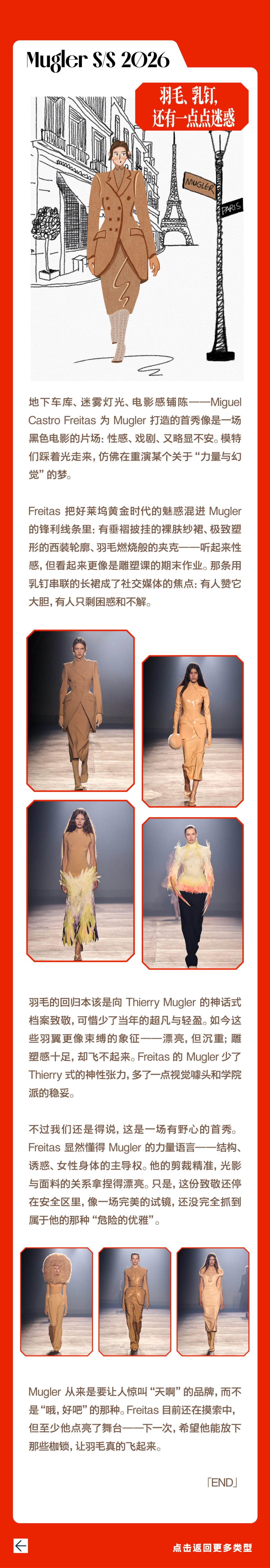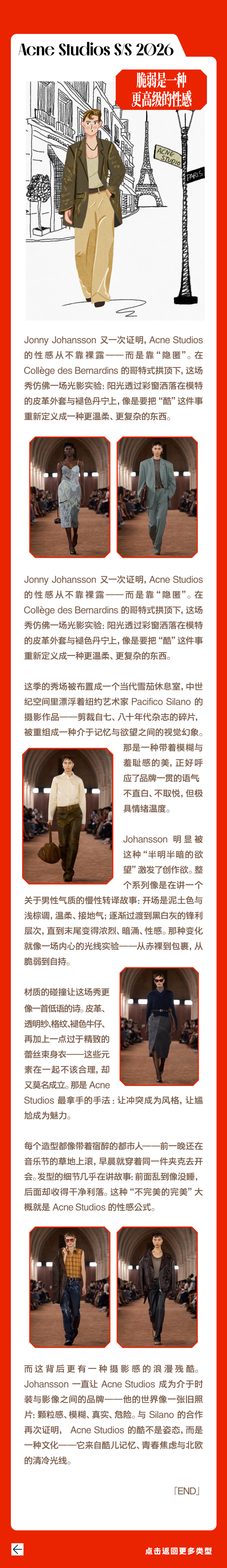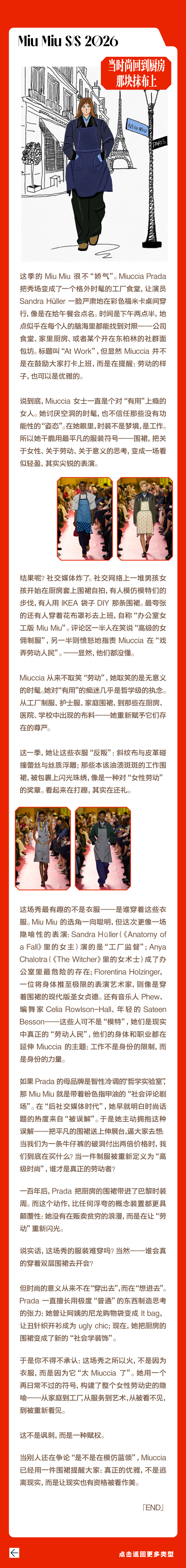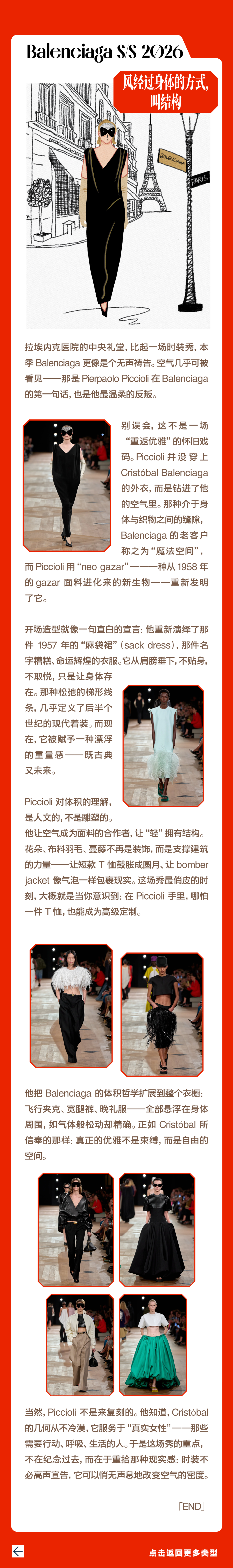 巴黎从来不只是时装的终点,它是场持续上演的戏剧。当纽约在理智、伦敦在叛逆、米兰在优雅之间徘徊,巴黎则选择——全都要。它是四大时装周里最无法预测、最情绪化、也最像一场梦的地方:高定与街头、哲学与派对、博物馆与夜店,全都可以在一公里范围内同时发生。没人能真正定义巴黎时装周——因为它的意义就在于“失控得刚刚好”。 这一季尤为如此。新一代设计师像闯入者一样闯进老牌体系:他们不膜拜经典,也不羞于颠覆。Saint Laurent的夜色在欲望和纪律间游走,Balenciaga的空气重新有了温度,Miu Miu的厨房变成社会学实验现场,而Maison Margiela的笑容——那被金属钉住的嘴角——简直是一种时代宣言:完美已经过时,不完美才性感。与此同时,Hermès让皮革呼吸、Alaïa让布料哭泣、Valentino用光点亮黑夜,连一向运动的Lacoste都开始谈浪漫。 这就是巴黎的魔法:它不追求统一的美学,而是让冲突本身成为一种风格。每个品牌都像在同一片天空下跳着不同节拍的舞——有人在沙地上缝皮革,有人在夜色里织尼龙,有人干脆在厨房里开发布会。巴黎时装周之所以迷人,不是因为它“最好看”,而是因为它永远有点不安分。这里的时尚像一场集体幻觉——闪光的、混乱的、真诚的、欲望横流的。下一秒会发生什么?没人知道。但正因如此,所有人都想再来一遍。 Saint Laurent:夜风吹动一场尼龙梦 在埃菲尔铁塔脚下,Anthony Vaccarello再一次让Saint Laurent看起来像一场欲望的纪律实验。特罗卡德罗广场的喷泉被掩在厚厚的白色绣球花海下——那是法国画家Cassandre设计的YSL标志,被放大成奢靡的花园,像极了某个法国寡头的秘密乐土。空气里有湿气、有香气,也有那种典型的Vaccarello式紧张感——性感但克制,危险又完美。 这一季的关键词?尼龙。这不是运动风的尼龙,而是能让人联想到摄影师Robert Mapplethorpe的皮革世界和演员Catherine Deneuve的秘密午后。Vaccarello把这种“材料变成性感的媒介:风衣、连衣裙、斗篷般的长裙,全都轻盈得像要飘走。颜色也带着Saint Laurent式的倦怠感——烟草棕、橄榄绿、病态的覆盆子红,还有那个七十年代的紫色唇膏调。轻薄的面料下,身体若隐若现,性感不靠裸露,而靠那一层随风晃动的模糊。 当然,Saint Laurent的经典癖好一个没少。大肩线、蝴蝶结白衬衫、皮革铅笔裙——这些元素像暗号一样重复出现。Vaccarello像一个狂热档案管理员,在每一次“重演”中加入一丝偏执。那件皮夹克的影子来自1960年Saint Laurent为Dior做的“Chicago”,那是高级定制第一次敢碰街头。六十多年后,他让它重新在夜色中闪光,金属扣环反射的不是车灯,而是巴黎的灯火。 整场秀像一场精致的错觉。乍看之下复古得要命,细看却轻得像像素。Vaccarello聪明地让怀旧与未来短路——那些尼龙裙没有内衬,没有刺绣,你甚至可以一把揉皱塞进包里。它们不是博物馆级的纪念,而是可被生活吞没的性感。 Miu Miu:当时尚回到厨房那块抹布上 这季的Miu Miu很不“娇气”。Miuccia Prada把秀场变成了一个格外时髦的工厂食堂,让演员Sandra Hüller一脸严肃地在彩色福米卡桌间穿行,像是在给午餐会点名。时间是下午两点半,地点似乎在每个人的脑海里都能找到对照——公司食堂、家里厨房、或者某个开在东柏林的社群面包坊。标题叫“At Work”,但显然Miuccia并不是在鼓励大家打卡上班,而是在提醒:劳动的样子,也可以是优雅的。 说到底,Miuccia女士一直是个对“有用”上瘾的女人。她讨厌空洞的时髦,也不信任那些没有功能性的“姿态”。在她眼里,时装不是梦境,是工作。所以她干脆用最平凡的服装符号——围裙,把关于女性、关于劳动、关于意义的思考,变成一场看似轻盈、其实尖锐的表演。 结果呢?社交媒体炸了。社交网络上一堆男孩女孩开始在厨房套上围裙自拍,有人模仿模特们的步伐,有人用IKEA袋子DIY那条围裙。最夸张的还有人穿着花布罩衫去上班,自称“办公室女工版Miu Miu”。评论区一半人在笑说“高级的女佣制服”,另一半则愤怒地指责Miuccia在“戏弄劳动人民”。——显然,他们都没懂。 Miuccia从来不取笑“劳动”,她取笑的是无意义的时髦。她对“有用”的痴迷几乎是哲学级的执念。从工厂制服、护士服、家庭围裙,到那些在厨房、医院、学校中出现的布料——她重新赋予它们存在的尊严。 这一季,她让这些衣服“反叛”:斜纹布与皮革碰撞蕾丝与丝质浮雕;那些本该油渍斑斑的工作围裙,被包裹上闪光珠绣,像是一种对“女性劳动”的奖章。看起来在打趣,其实在还礼。 如果Prada的母品牌是智性冷调的“哲学实验室”,那Miu Miu就是带着粉色指甲油的“社会评论剧场”。在“后社交媒体时代”,她早就明白时尚话题的热度来自“被误解”。于是她主动拥抱这种误解——把平凡的围裙送上伸展台,逼大家去想:当我们为一条牛仔裤的破洞付出两倍价格时,我们到底在买什么?当一件制服被重新定义为“高级时尚”,谁才是真正的劳动者?一百年后,Prada把厨房的围裙带进了巴黎时装周。而这个动作,比任何浮夸的概念装置都更具颠覆性:她没有在贩卖贫穷的浪漫,而是在让“劳动”重新闪光。 说实话,这场秀的服装难穿吗?当然——谁会真的穿着双层围裙去开会?但时尚的意义从来不在“穿出去”,而在“想进去”。Prada一直擅长用极度“普通”的东西制造思考的张力:她曾让阿姨的尼龙