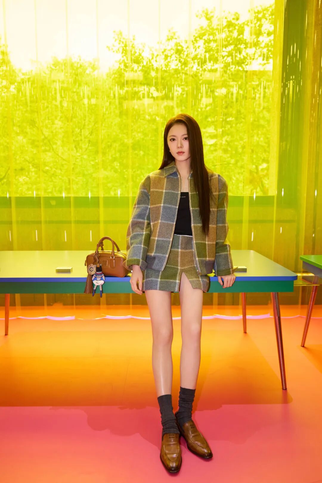 赵今麦则选择翻领格纹毛呢套装,内搭纯色针织衫,简约精致。棕色手提包与同色鞋子呼应,增添温暖色调,也让甜美造型更添一丝酷感。
