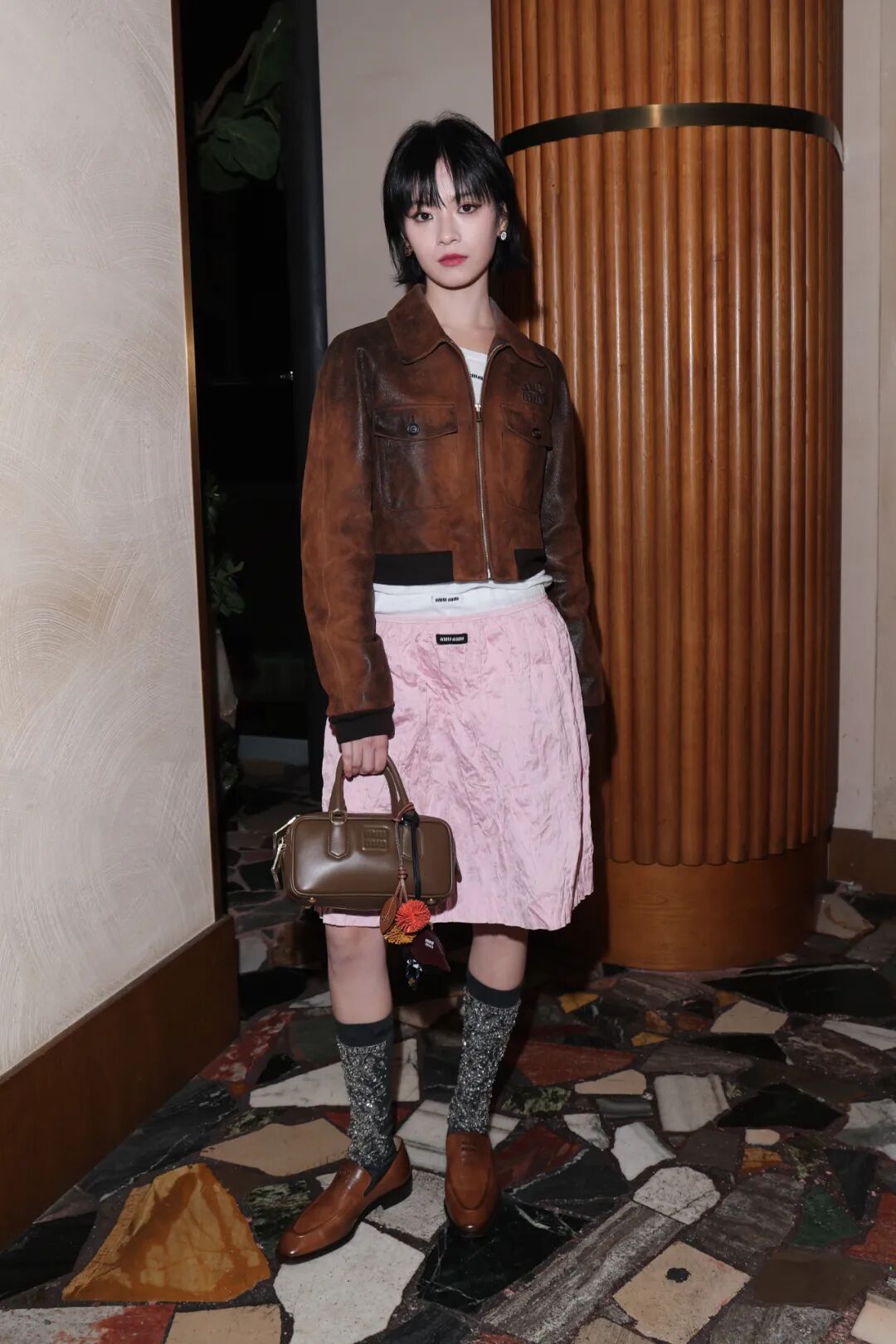 李庚希的整体造型在复古与现代之间达到了平衡感。以棕色短款翻领皮夹克搭配 Miu Miu 经典半身裙,轻松驾驭 Miu 系千金风。