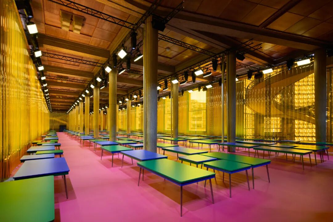 秀场置景也暗含深意,将巴黎耶纳宫(Palais d’Iéna)柱廊大厅这一承载工作职能的场所,转化为对日常生活的抽象演绎。而点缀其间的意式复古 Formica 桌台,又将日常生活的烟火气带入这片圣殿,将职业与生活的融合具象化。