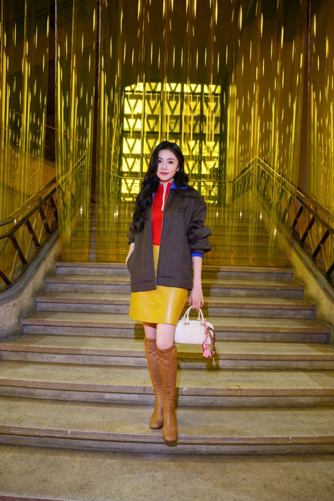 刘浩存以复古摩登风格亮相,无袖运动毛衣搭配质感十足的皮革半身裙,红与黄的撞色充满活力与灵动。外搭的灰色短夹克,领口与袖口的宝石蓝撞色处理点亮层次感。棕色皮革长靴与 Arcadie 手提包的点缀,更显复古韵味。