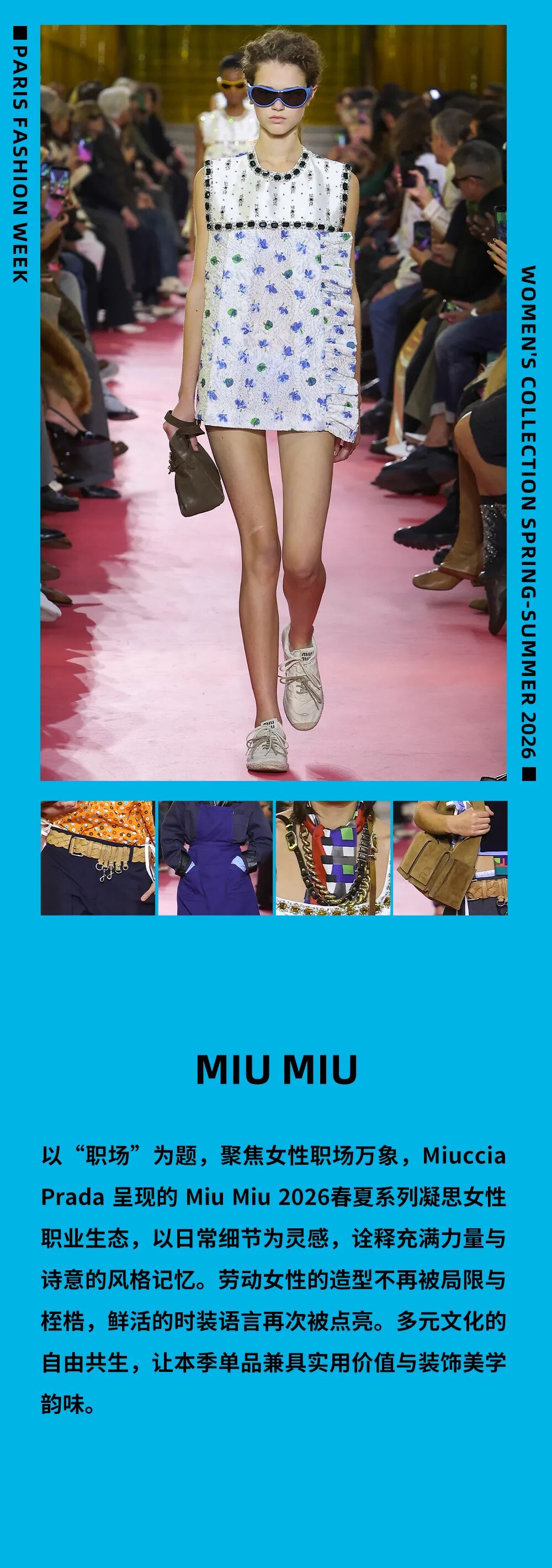 Miu Miu 2026 春夏系列精心构筑了一个全新概念的“职业衣橱”。它不局限于某一特定行业,融入了更多对职业女性的思考。这一系列不再仅仅追求表面的甜美,而是深植于现实,展现出一种坚韧而柔韧的力量。以时尚为语言,为各行各业的女性“工作者”奏响了一曲颂歌。