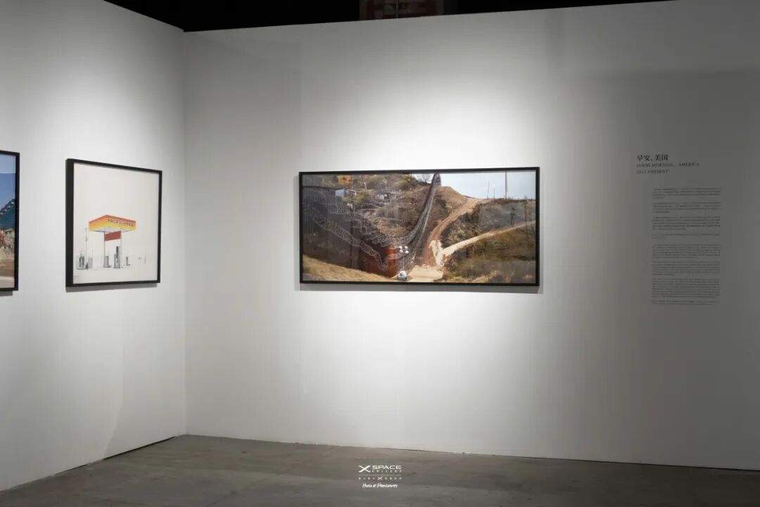 一张拍摄于加利福尼亚州的照片显示了一个巨大的停车场,几乎不见边际。在停车场中央,一座孤零零的快餐店显得格外渺小。此种构图方式不禁令人想起美国摄影师沃克·埃文斯的作品,但又带有明显的欧洲视角,充斥着对美国式空间尺度的惊讶与反思。