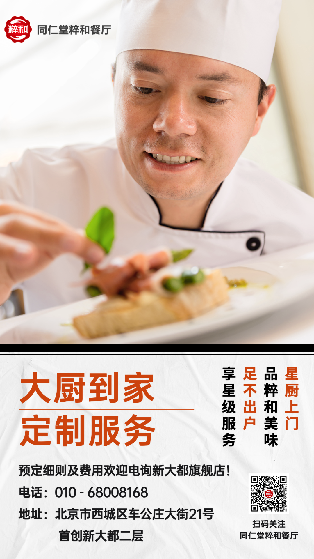 同仁堂粹和餐厅诚意推出大厨到家定制服务,根据客户的实际需求,定制菜品搭配。星级大厨上门服务,让您从此摆脱烹饪烦恼,轻松解放双手,纵享足不出户的奢味飨宴。