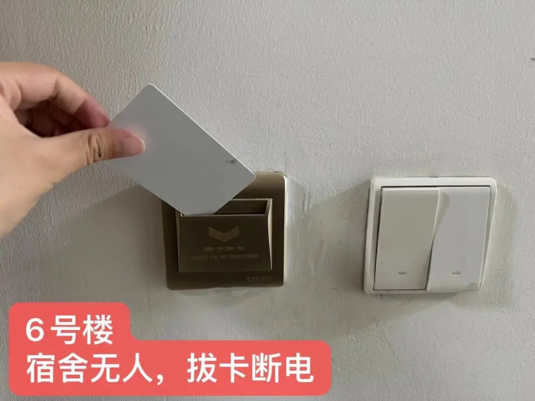 6号楼宿舍无人,拔卡断电;5号楼宿舍可养成关闭电闸的习惯(省电小妙招)