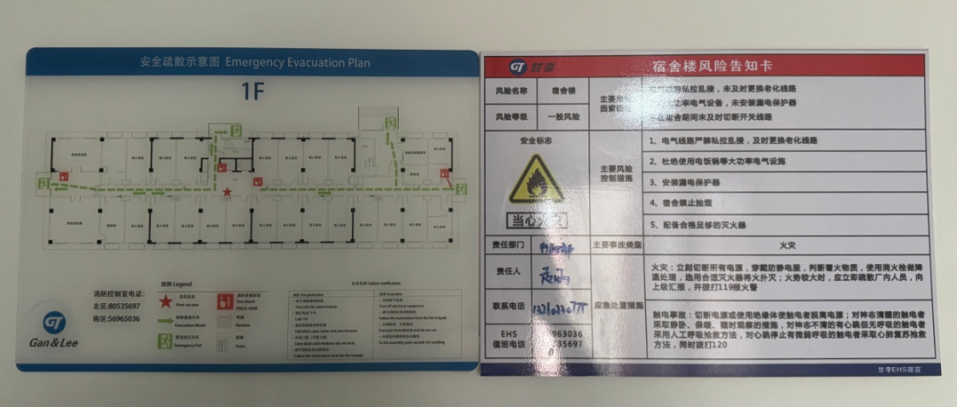 楼宇内均有张贴安全疏散示意图和宿舍风险告知卡,便于意外发生前大家快速撤离