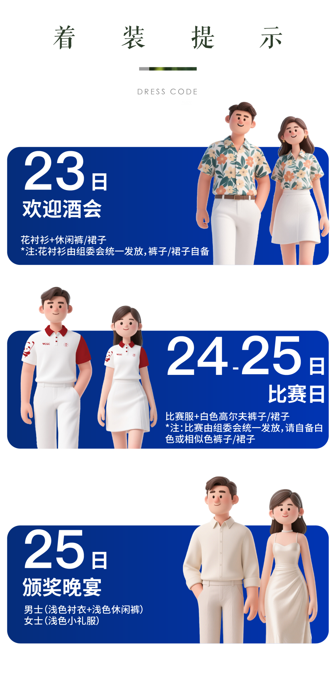 ● 着装准备:请根据以下场合的着装要求,准备相应衣物。