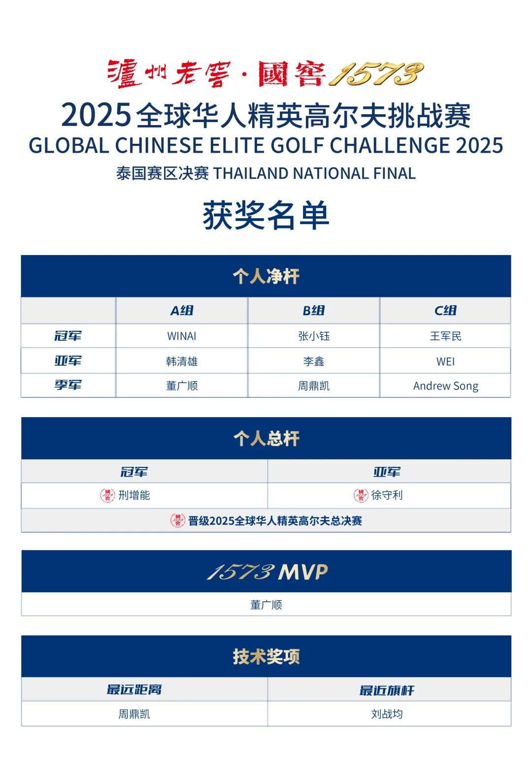 经过激烈角逐,董广顺、周鼎凯、Andrew Song分别斩获A、B、C组个人净杆冠军。1573 MVP、最远距离、最近旗杆等奖项也花落各家。